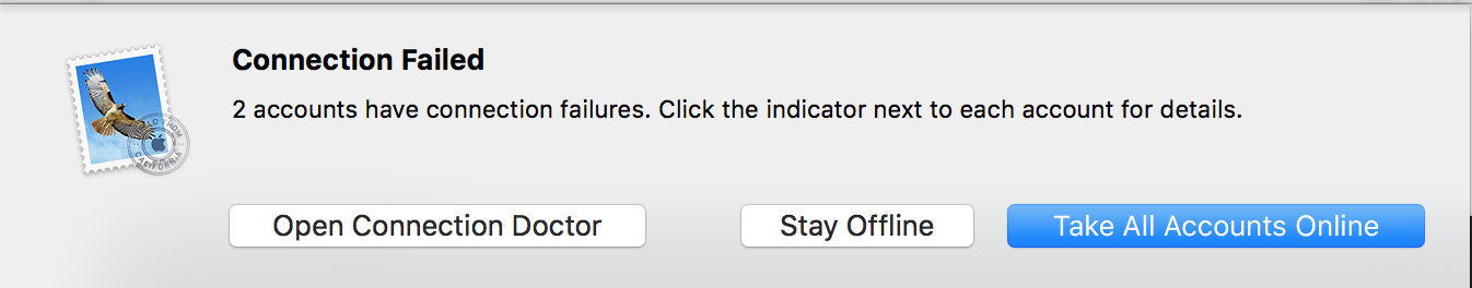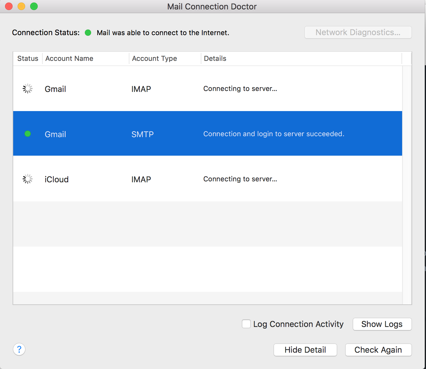 When I click the exclamation mark, it just says there are connection problems. I click Connection Doctor, and there's a spinning wheel for the IMAP connections, while the SMTP connection is always fine. I don't really know what that means.