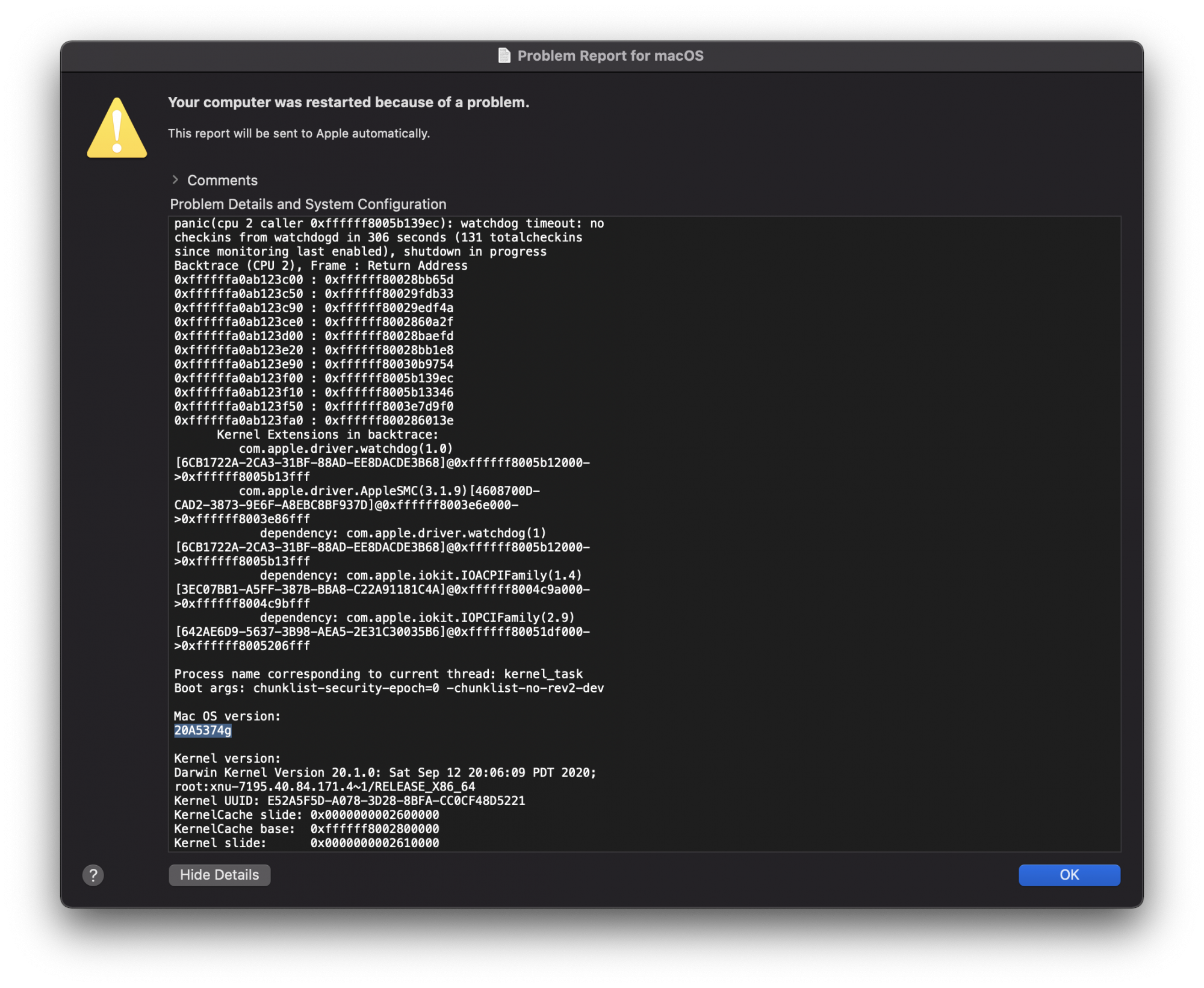 Yesterday, I had to disconnect the machine from the Thunderbolt-Dock (CalDigit USB-C ProDock, which is USB-C as well as TB3, depending on the host's capabilities) after I sent it to system sleep; sometime down the road, it apparently KP'd as I had to boot it up after reconnecting it to the TB-dock today. The KP message wasn't watchdog or WindowServer, it was something about Bluetooth; unfortunately, I can't find it anymore in the console - the report is gone (as are a lot of other KP reports, only one report about Adobe Acrobat crashing back in May...