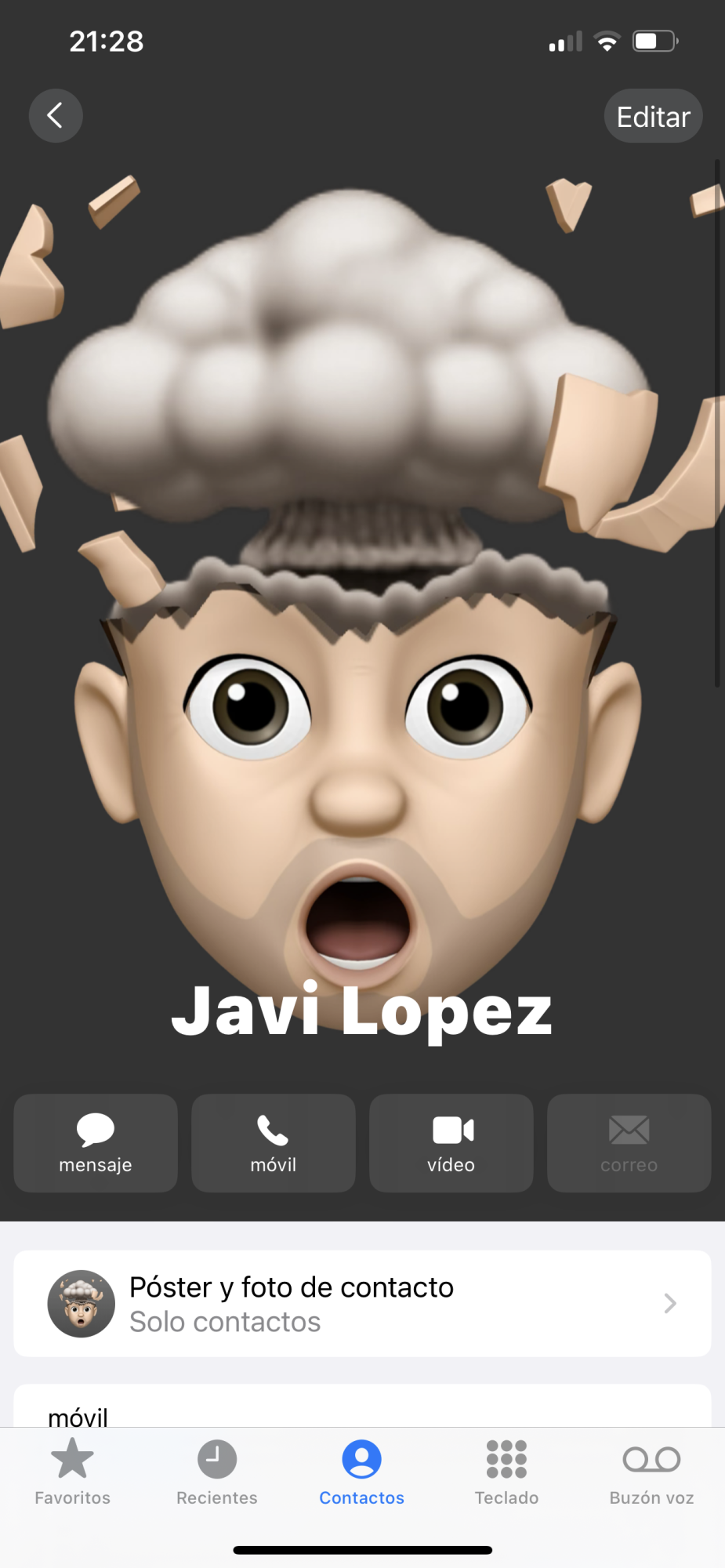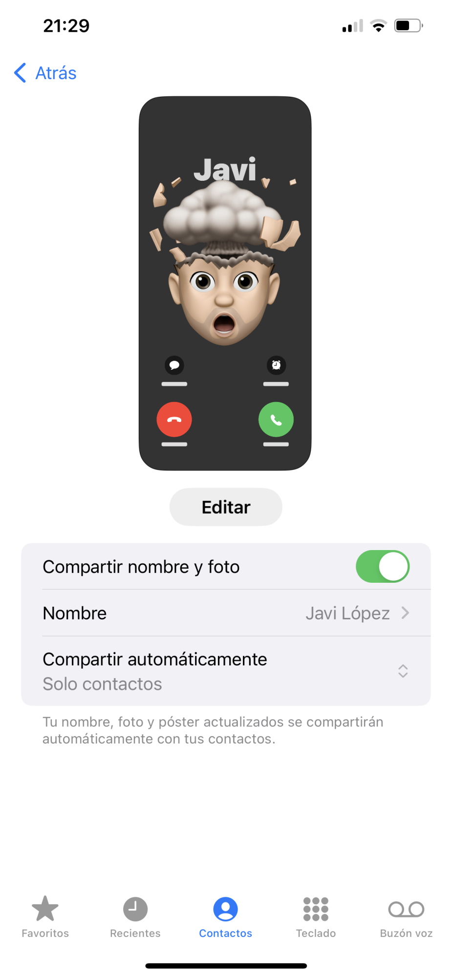 It didn't work for me with friends or anyone. you have to have the name of your contact card the same as in the contact poster setting For example, if your card has the name Javi, in the contact poster setting you must have Javi (both the same) This is how my friends and I have done it and it works super well for everyone. I put photos....