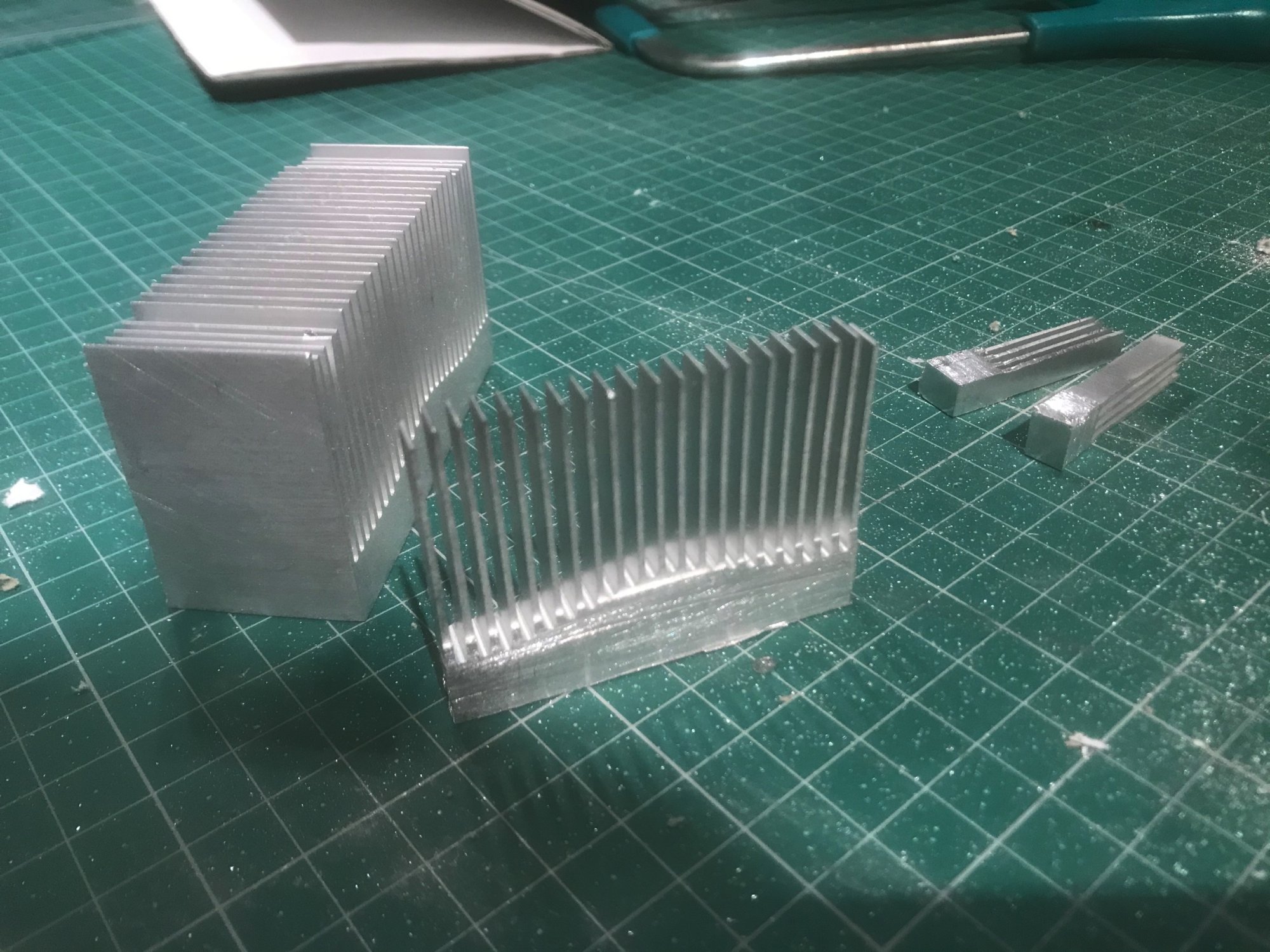 It was some work to cut that heatsink. I did use some er..Grizzly thermal paste to attach/connect the fins. So some decent heat transfer there I think. They are also pressing against each other very tightly. It's a little unstable though, and it would have been nice to weld it together slightly.
