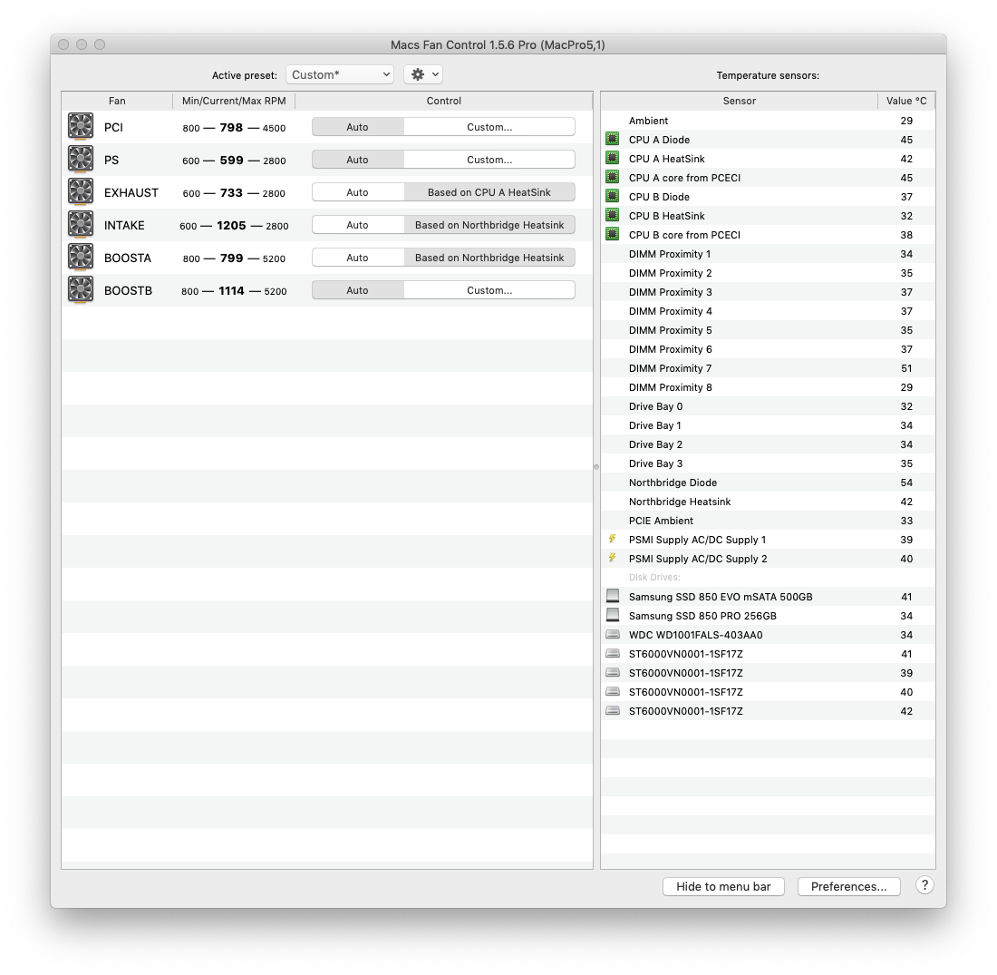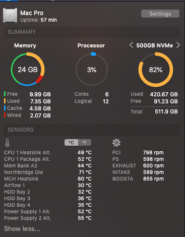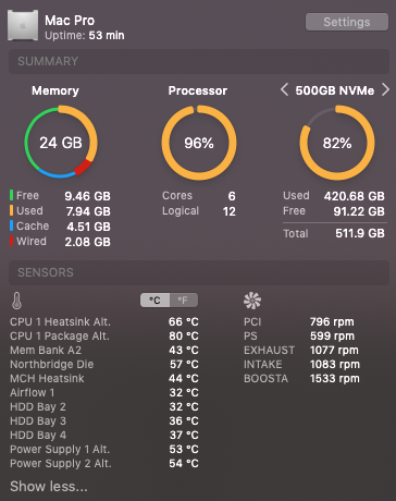 Bear in mind that IBM x346 had a similar power density but with 16 redundant fans and no effective sound output limits. X346 26.44 litres with 2 x 650 Watt Power Supplies giving 51 Watts per litre versus Mac Pro 5,1 with 43 litres and 980 Watts 22.8 Watts per litre or less than half the density. No criticism intended but there are therefore weaker spots in the design, aka the NB thermal problem!