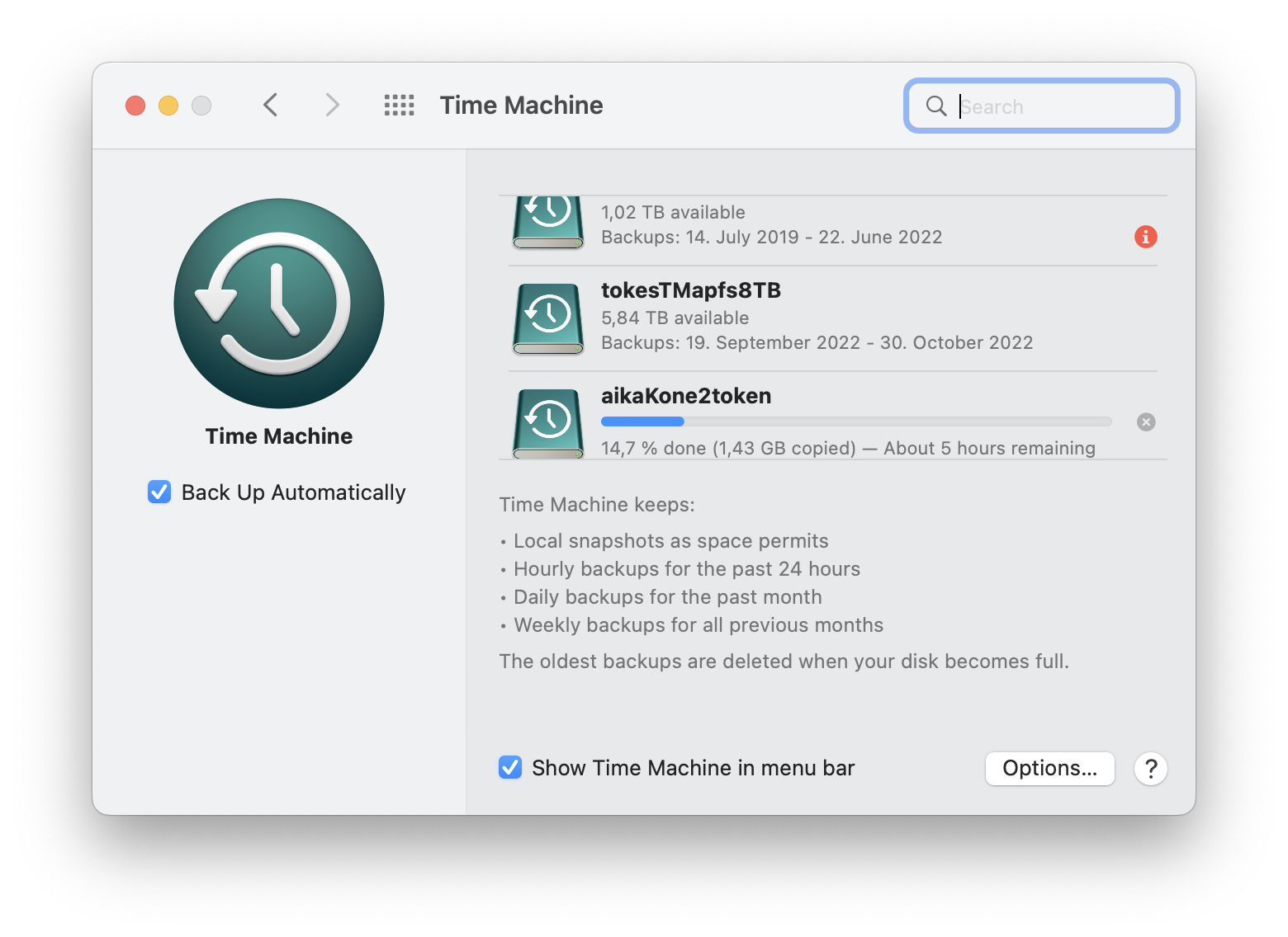 2022-09-18 18:16:39.073776+0300 localhost backupd[254]: (TimeMachine) [com.apple.TimeMachine:General] Mountpoint '/Volumes/aikaKone2token' is still valid