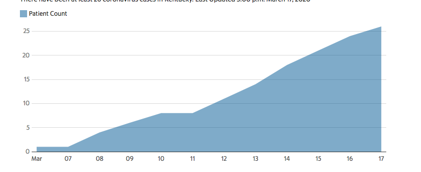 On the local front, Kentucky is up to 26 cases(including 1 death and 1 full recovery), so at least the spread here is slow at this point. I'm hoping that the strong steps the governor has taken keeps the growth slow. So far, things are looking promising considering that the first case was reported 11 days ago(March 6th). Although still early, the slope of the total case count increase seems to have decreased over the past few days.