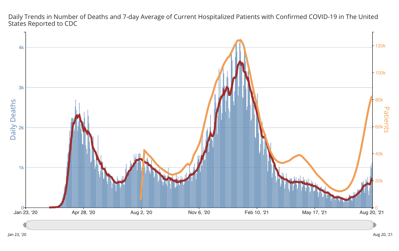 Yeah, that is what I was saying a few days ago. The deahts and hospitalization chart doesn't follow the cases trend as it used to do before (almost identical trends), which is HUGE news and strong evidence that vaccines are working.This is an interesting chart from the CDC. It seems to show much fewer deaths from hospitalizations. Or, that hospitalizations and deaths were highly correlated until more recently.
