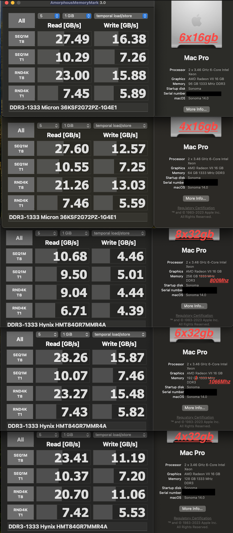 View attachment 2297290Found and picked up some seemingly rare dual rank 32gb netlist hypercloud ram for my cMP 5.1. Attempting to see if I can run 192gb @ the full 1333 mt/s speed! I searched all over but could find no one running 32gb dimms that we're not quad ranked. Most 32 GB sticks are quad ranked and push the speed down to 1066 when running triple channel.