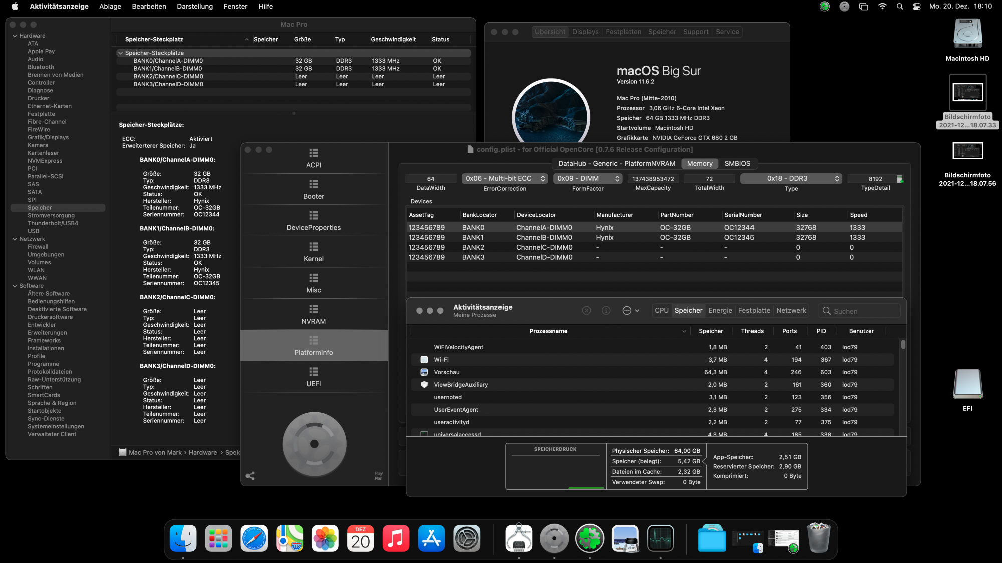 At present, we are 2 Danish fellows who've documented our success.So given these screenshots I'm curious how this Danish fellow managed to pull off 256gb @ 1333mhz in Big Sur. With 8 modules installed it should run at even slower 800mhz. Magic I tell you, magic!