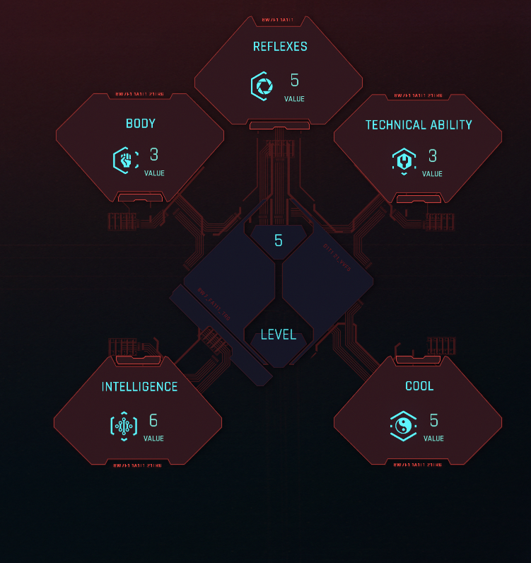 Attributes: At the top are 5 general Attributes (general abilities): Body, Reflexes, Technical, Cool, and Intelligence. For example the Body Attribute is enhancement of the body, physicality, Reflexes improves reflexes, etc.