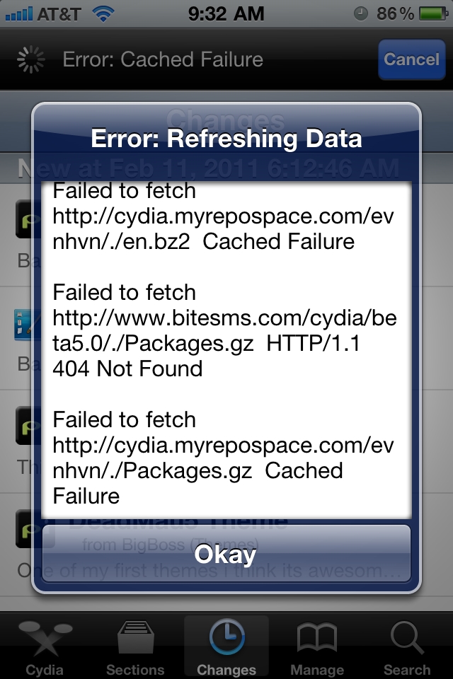 J Jnardis macrumors 6502a Original poster Jun 2, 2010 654 0 Feb 11, 2011 #1 Anyone else getting this error from Cydia when trying to update: Attachments error.JPG 272.2 KB · Views: 28