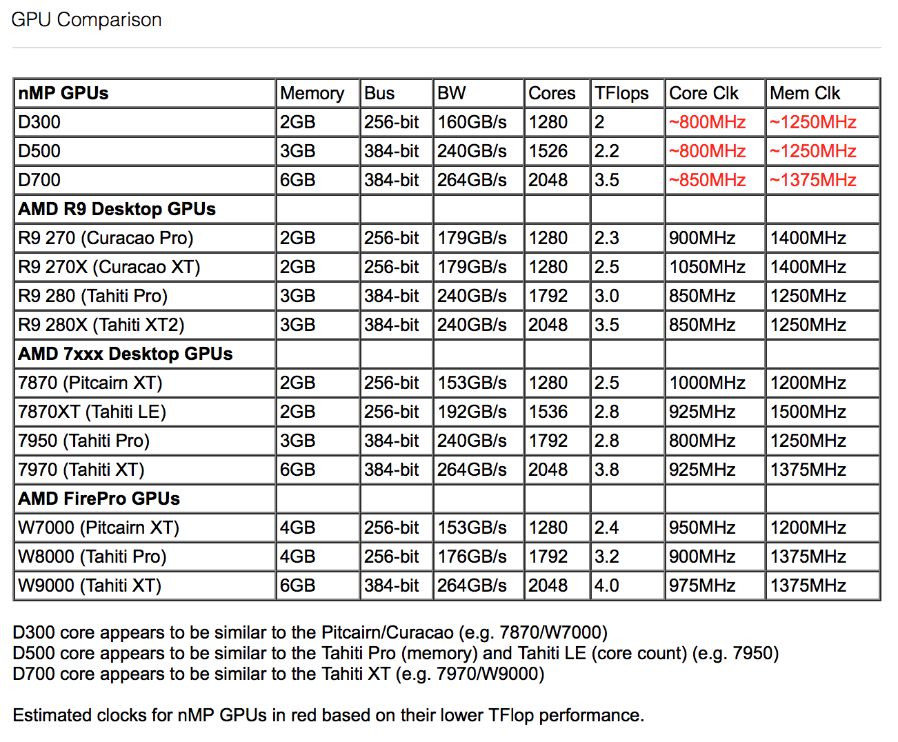 Architosh believes it's a W8000. I'm unclear on what consumer GPU that is equivalent to, but they firmly state it is Tahiti while the 7870 above is Pitcairn I believe.