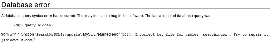 I've been given a database error after saving a few of my recent edits. It doesn't seem to have had any noticeable effects (the changes are still going through), but it might be worth looking into.