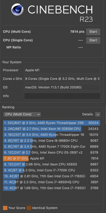Overall very impressed with the M1 MBP's performance as it easily lives (computationally) with my fast W10 17" hex core notebook. The M1 isn't as versatile as the 17" equally it's truly a portable powerhouse :)