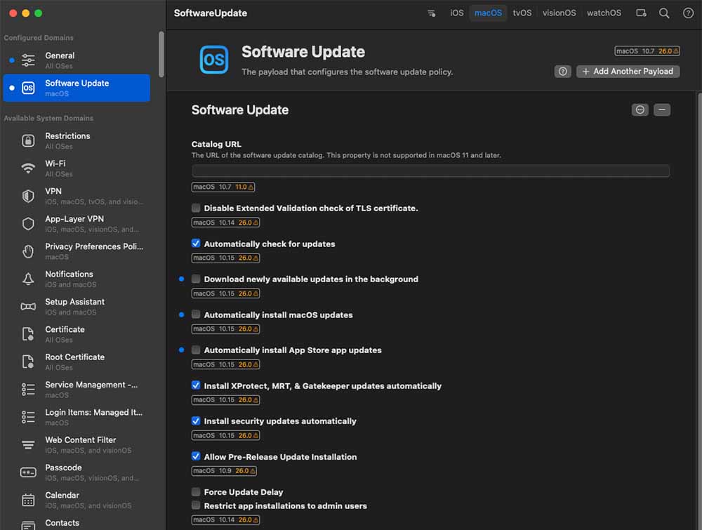 As Apple has depreciated enforcedSoftwareUpdateMajorOSDeferredInstallDelay and SoftwareUpdate, it is unclear at the moment if the profiles will work and prevent Tahoe for being shown in Software Update on Macs running Sequoia.