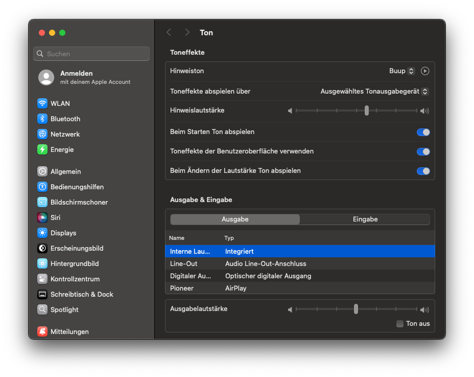 no, You should adjust that with the pref pane. This is german, but you will find it by comparing the lines:Thank you for the response, I appreciate it. So if I want to continue using the latest OS with OCLP, i'm going to have to live with just getting audio through my internal speakers then.