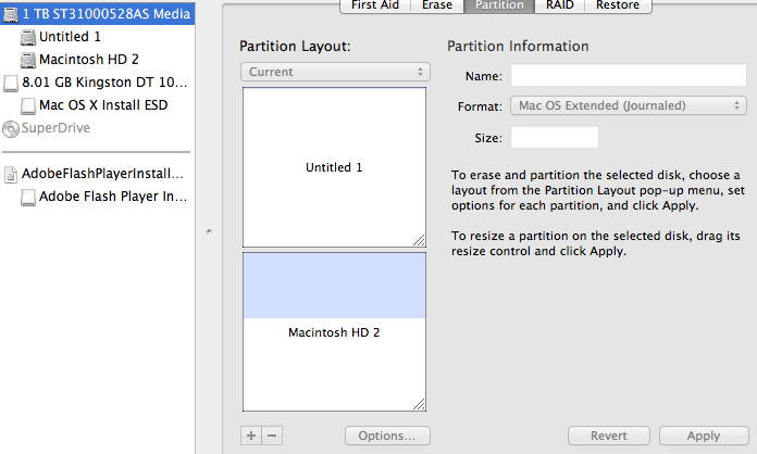 I then deleted the Mavericks partition (which was Macintosh HD). Then I realised I couldn't extend the HD 2 partition upwards, so I was left with this empty space!