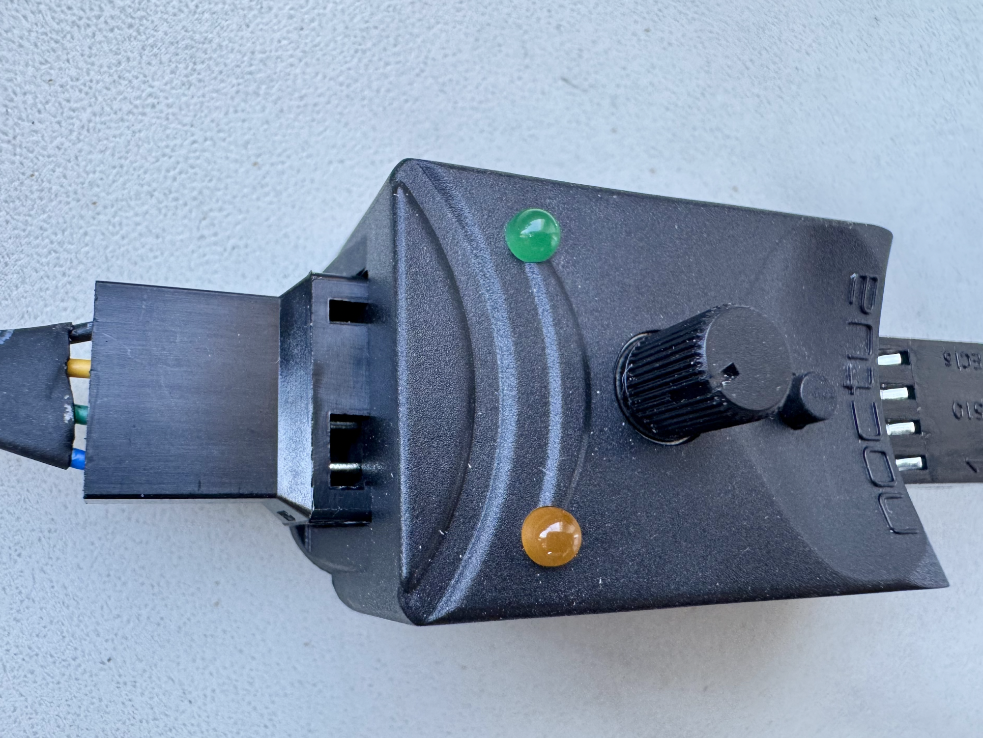 Installed new displayboard, padding the back of the casing with electric tape to not shortcircuit again. New controlstrip, soldered IR extension and soldered on cables from original powerswitch. Worked sort of....