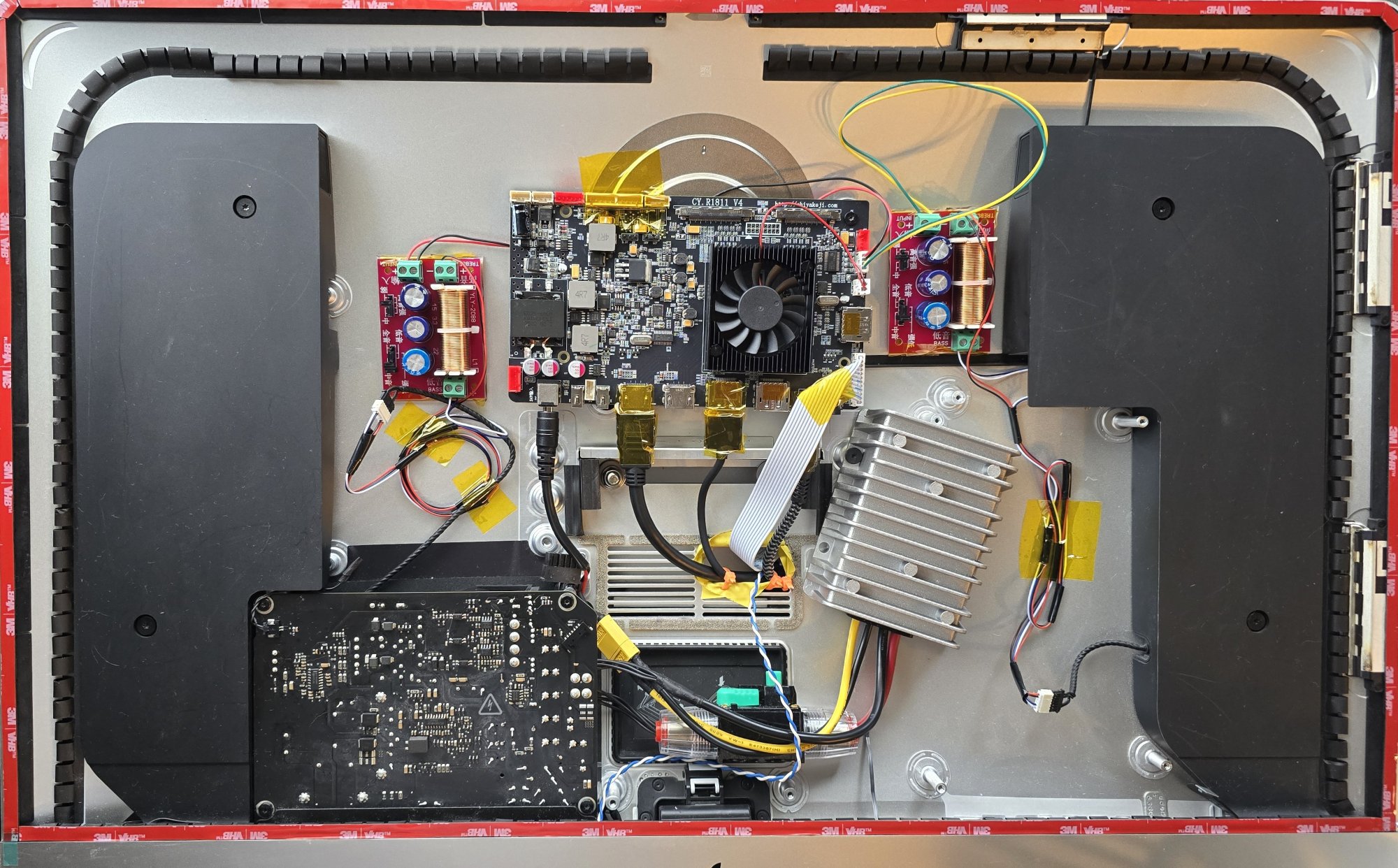 My setup is; original iMac 2017 speakers, original iMac 2017 PSU. I added a 12V to 24V step-up converter & 15A automatic fuse from Amazon and the cross-over filters that StoneTaskin provides. I also disregarded the "replacement" adhesive kit from Amazon and went for real Chinese made "3M" foam tape which very closely mimics the original Apple foam tape. See a full image of my setup just before I attached the display here: