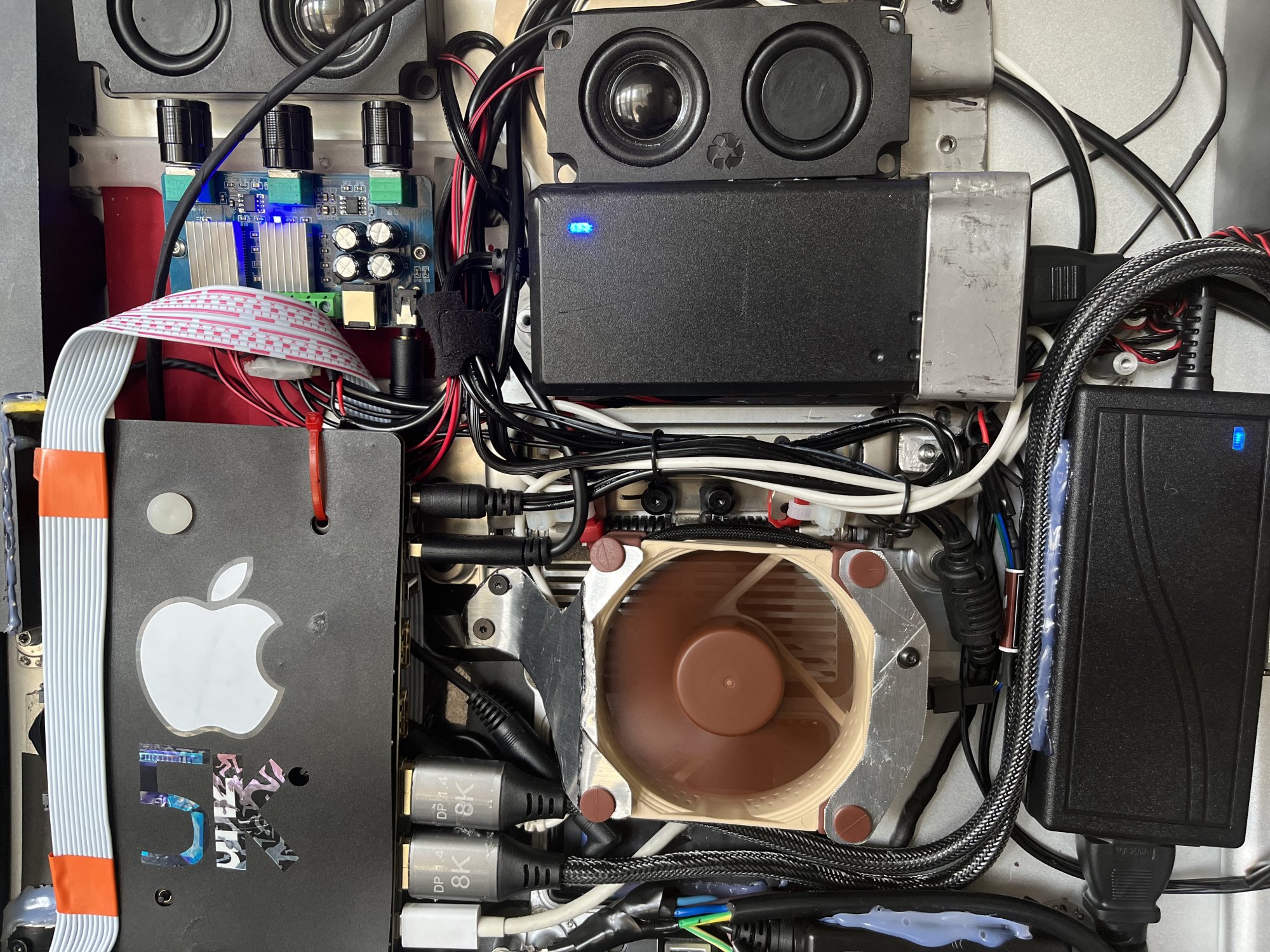 You’ll see 6 wires coming off of the iMac speaker connector. Clip the connector off. You’ll need to extend the length of the wire with some random wire you have around ( you can use the Stonetech speaker wire if you purchased). Roll back the sheathing. 2 of the connectors are not in use, leaving you with only sub+, sub-, tweet+,tweet- per speaker. To find which ones which I just connected them to the 10W amp. It was pretty clear which one was which. Subs were connected to the 20W output.Tweets to the 10W. The secondary speakers were also connected to the 10W. They sounded really nice connected to the 10W’s as mids. iMac and secondary Speakers were eventually powered by a 12V 5A 60W inverter, coupled with a 20W+10W+10W 12V amplifier. The 4 pin audio out on the driver board didn’t end up working, it was much easier just connecting the aux cable to the audio jack.