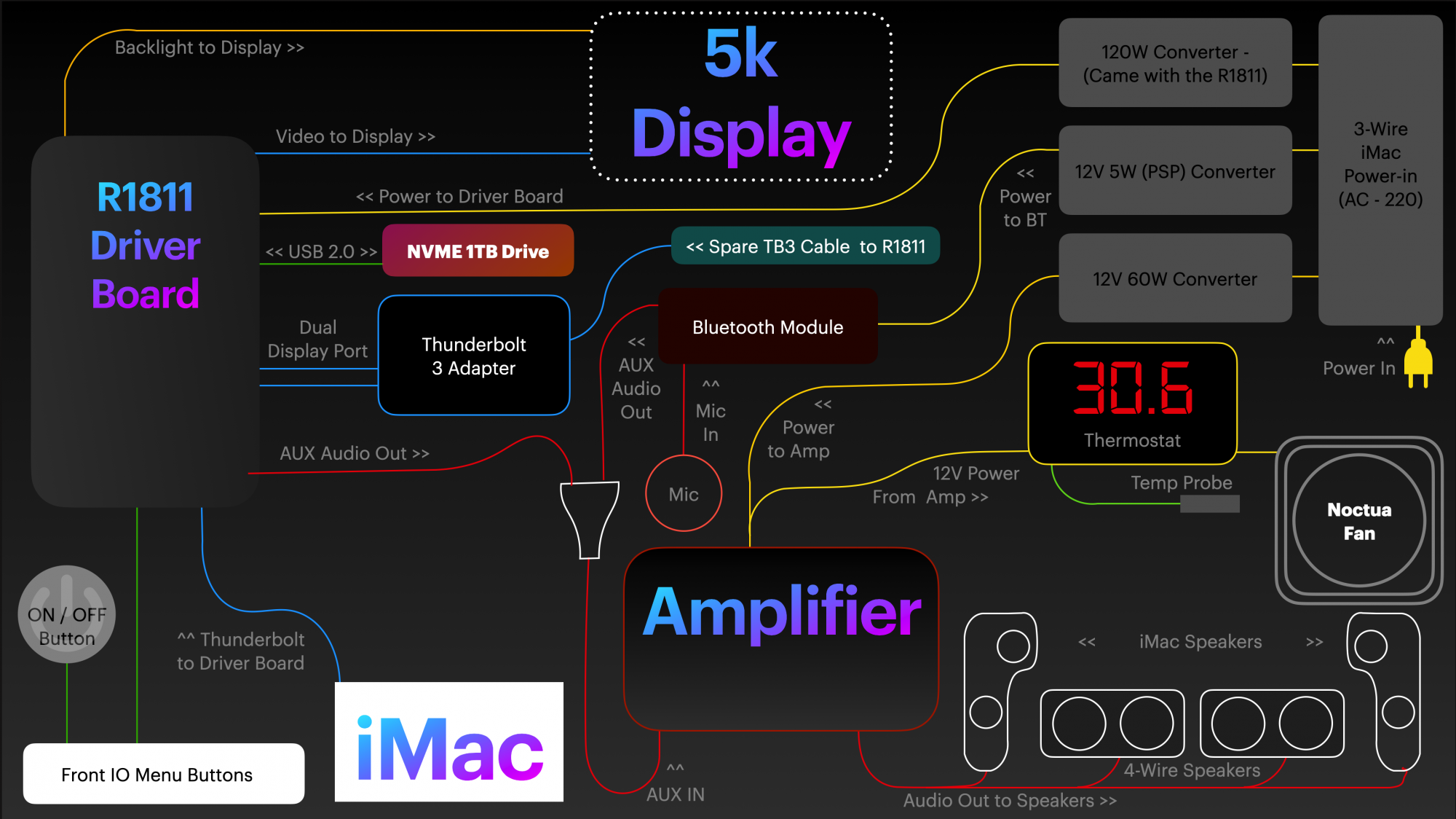 Of course the iMac's power button will no longer turn off the new power supply you are using to power the R1811 board, so this will remain operational and connected to mains power.