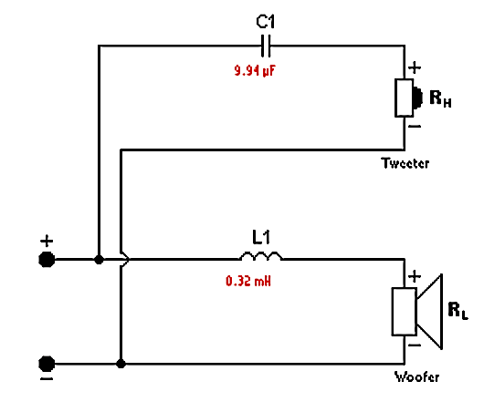 “To connect to the R1911 board maintaining the correct 4Ω impedance of the speaker units you could use a 10 microFarad capacitor in series with the tweeter, and a 0.32 milliHenry inductance (coil) in series with the woofer.