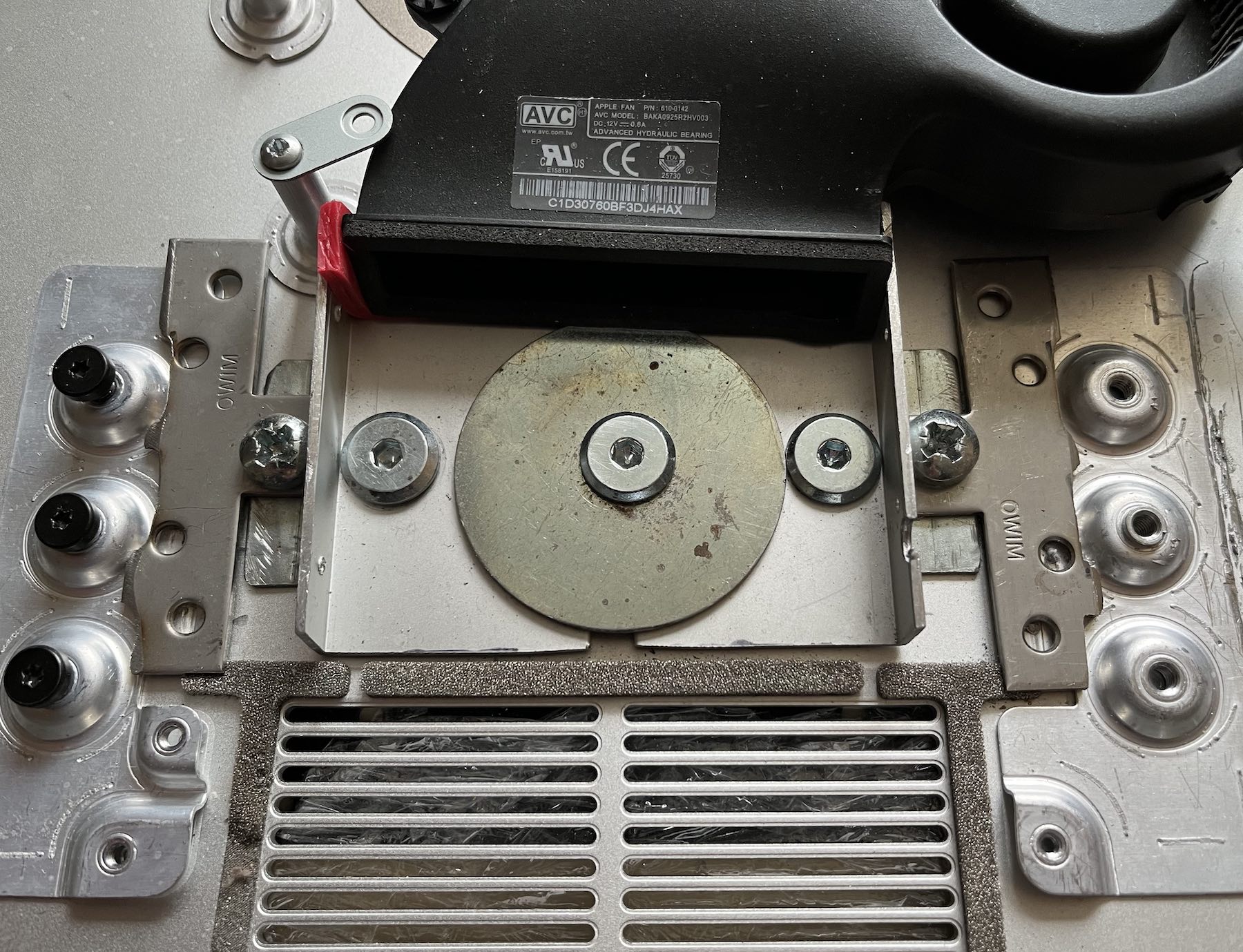 5 iMac 21 fan (new) fitted back-to-front to cool the PSU, kept inaudible by a variable speed 4 wire PWM controller, with temp probe to PSU.