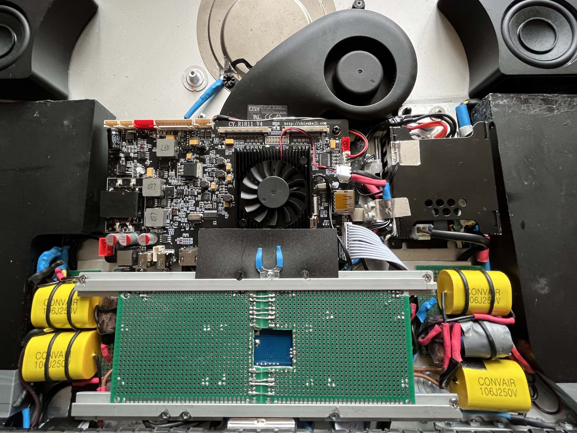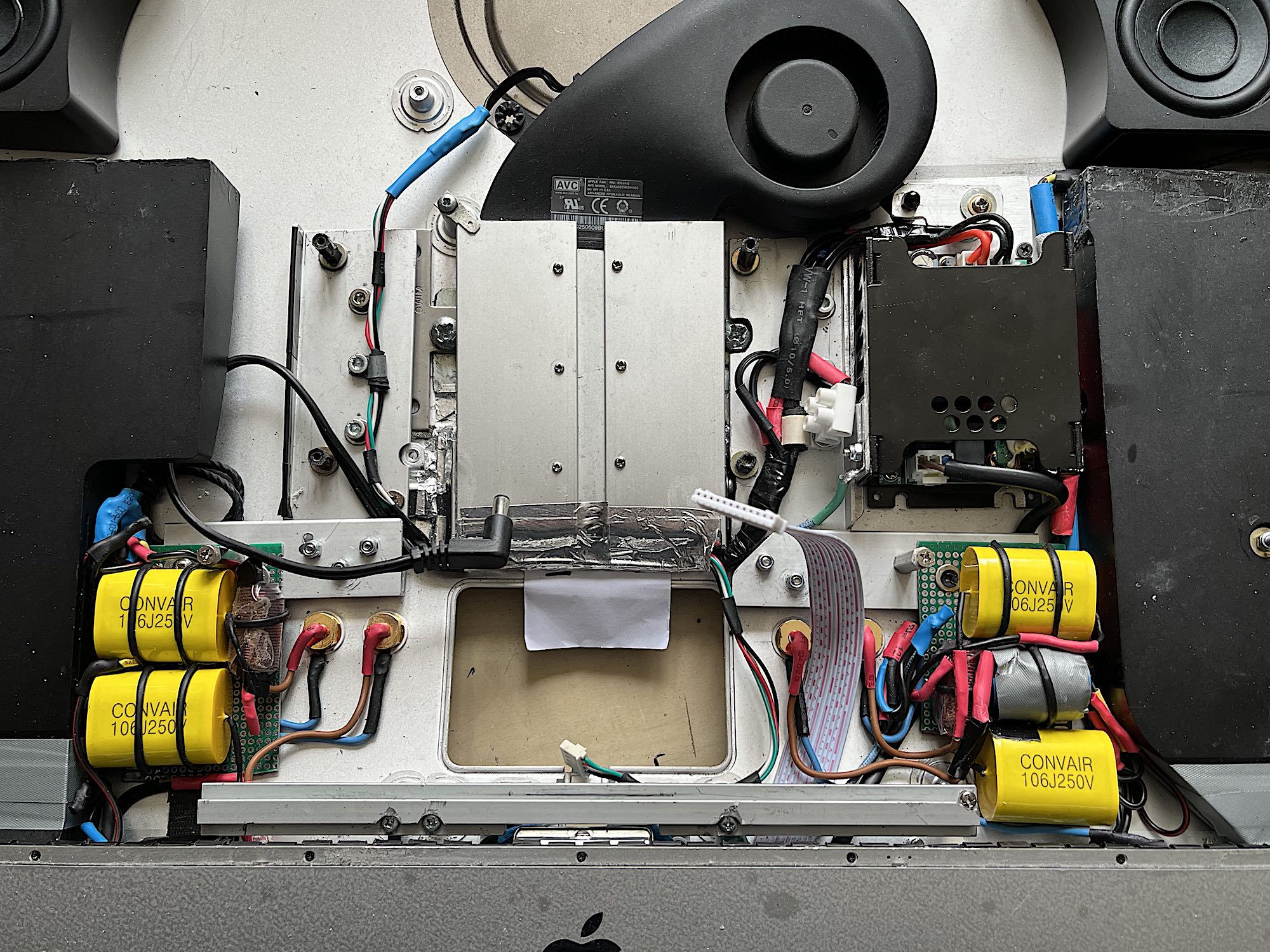 Backed with sections of the aluminium shell from a damaged iMac 27 to retain the acoustic properties of speakers.