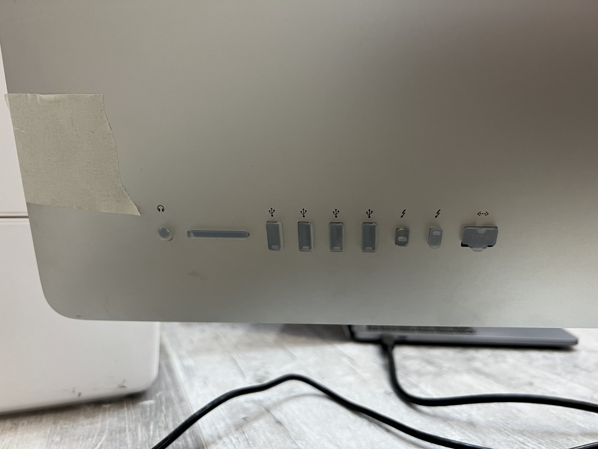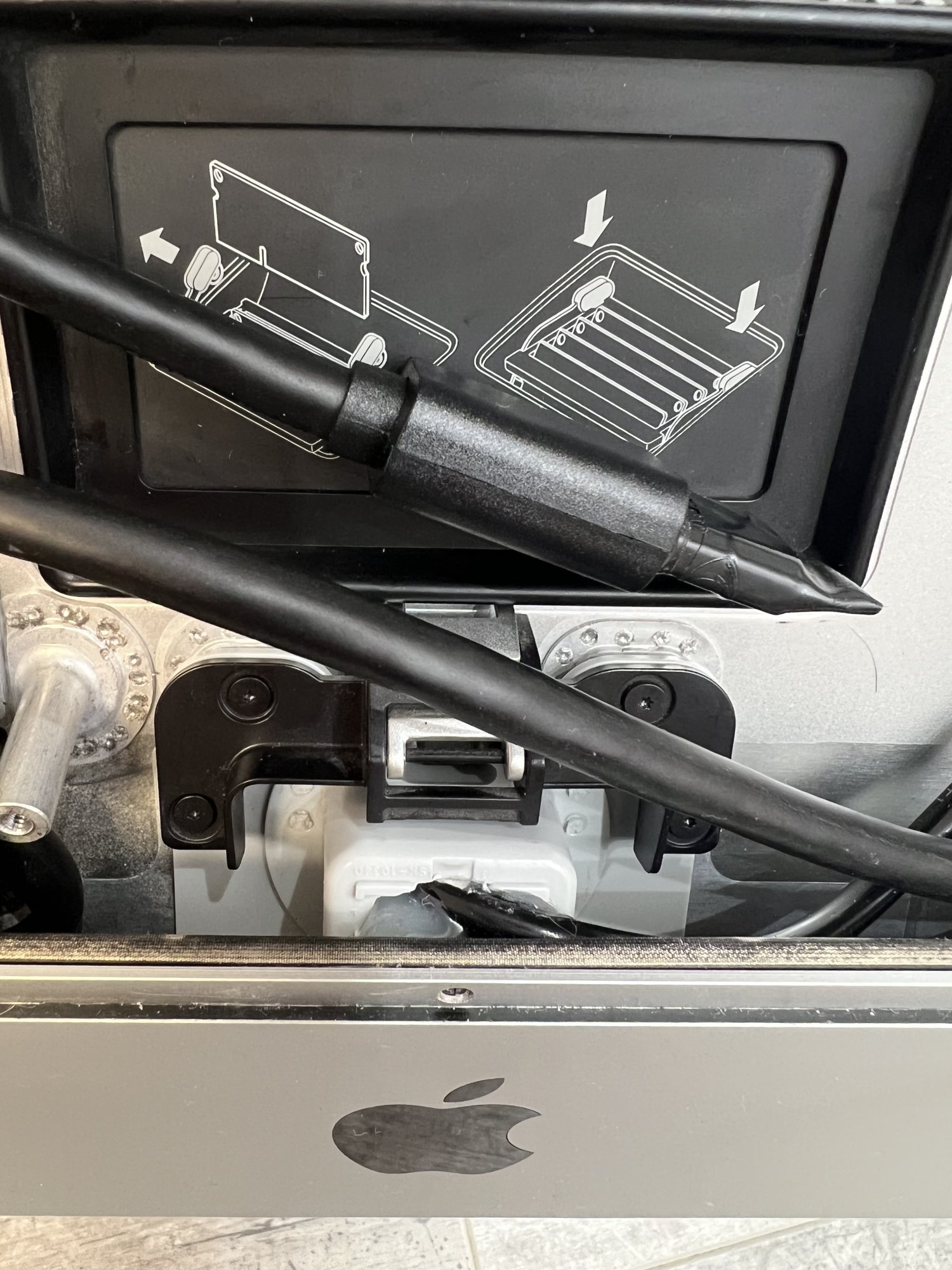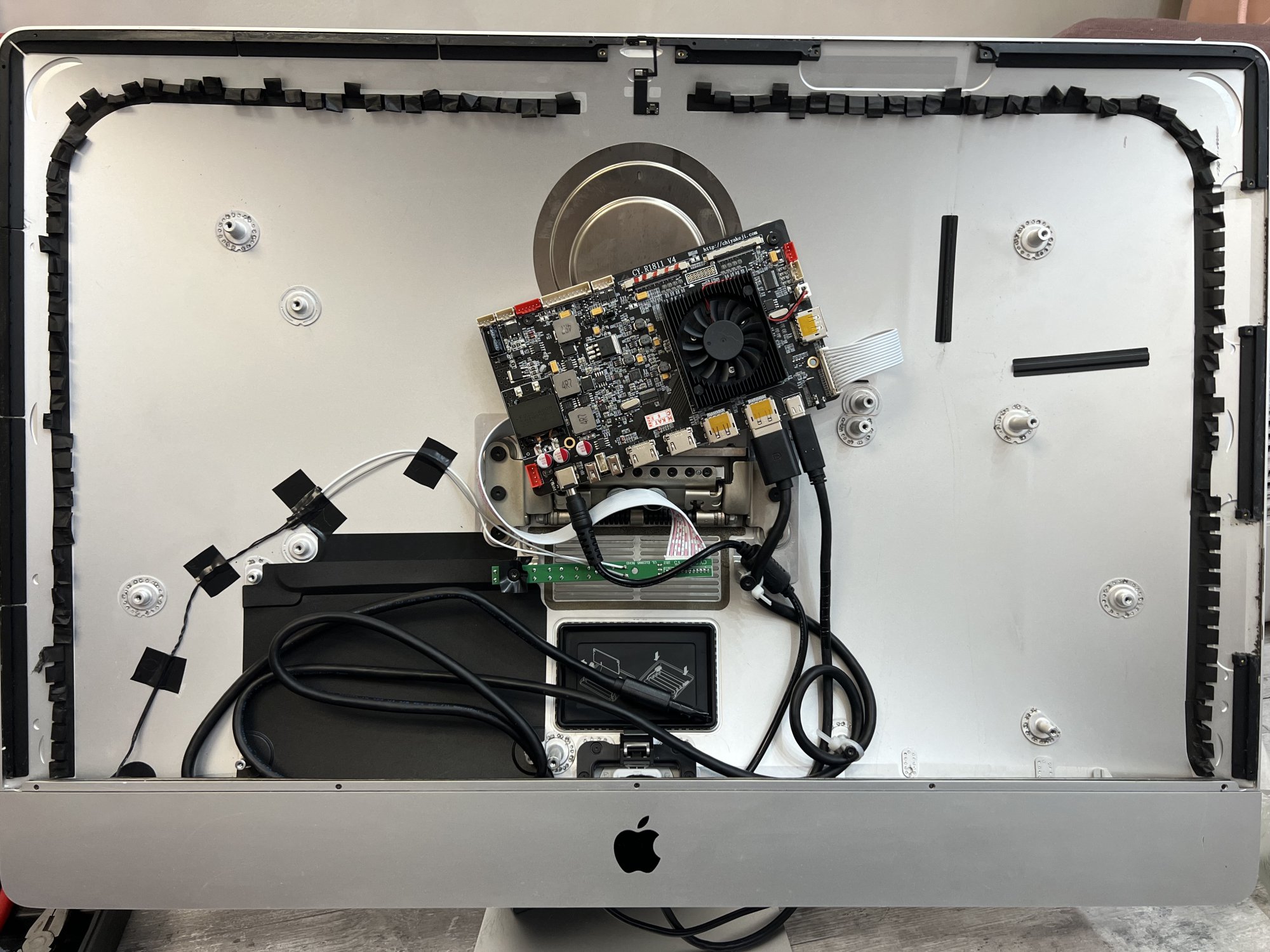 The existing iMac power-on button has had to be removed and the hole blanked-off.