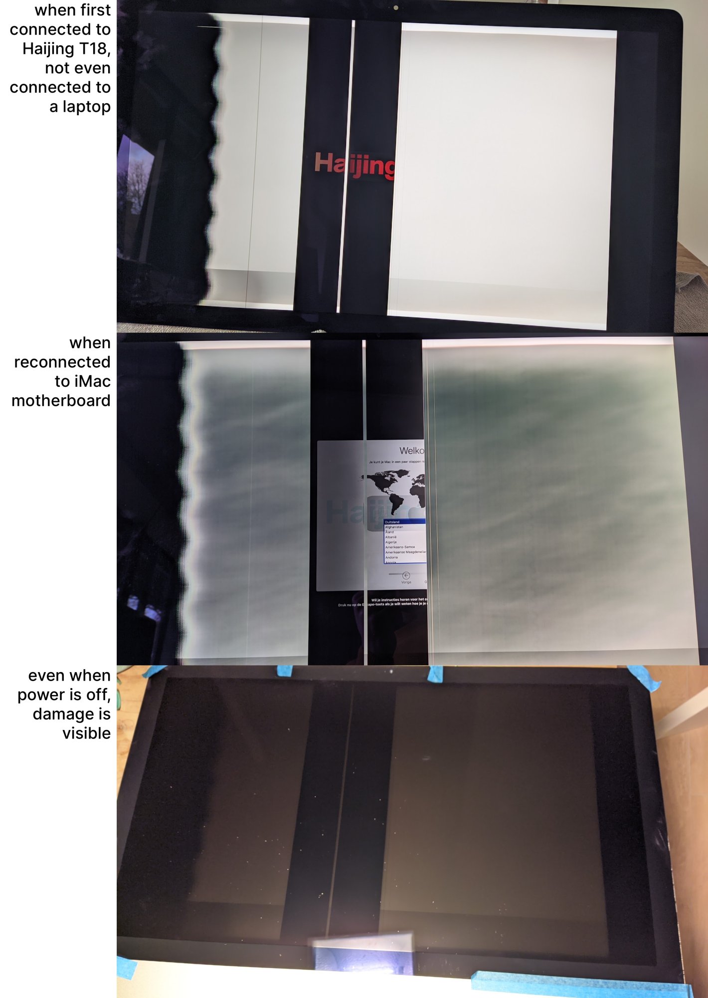 My T18 has been running 4 to 8 hours a day for two months now with no issues at all. It certainly seems like you got sent the wrong connectors for your panel...or some of those very thin wires got kinked or twisted and broken internally, but didn't break through the insulation.Yes, it did work... now even when I reconnect the iMac motherboard I still get a bad image...