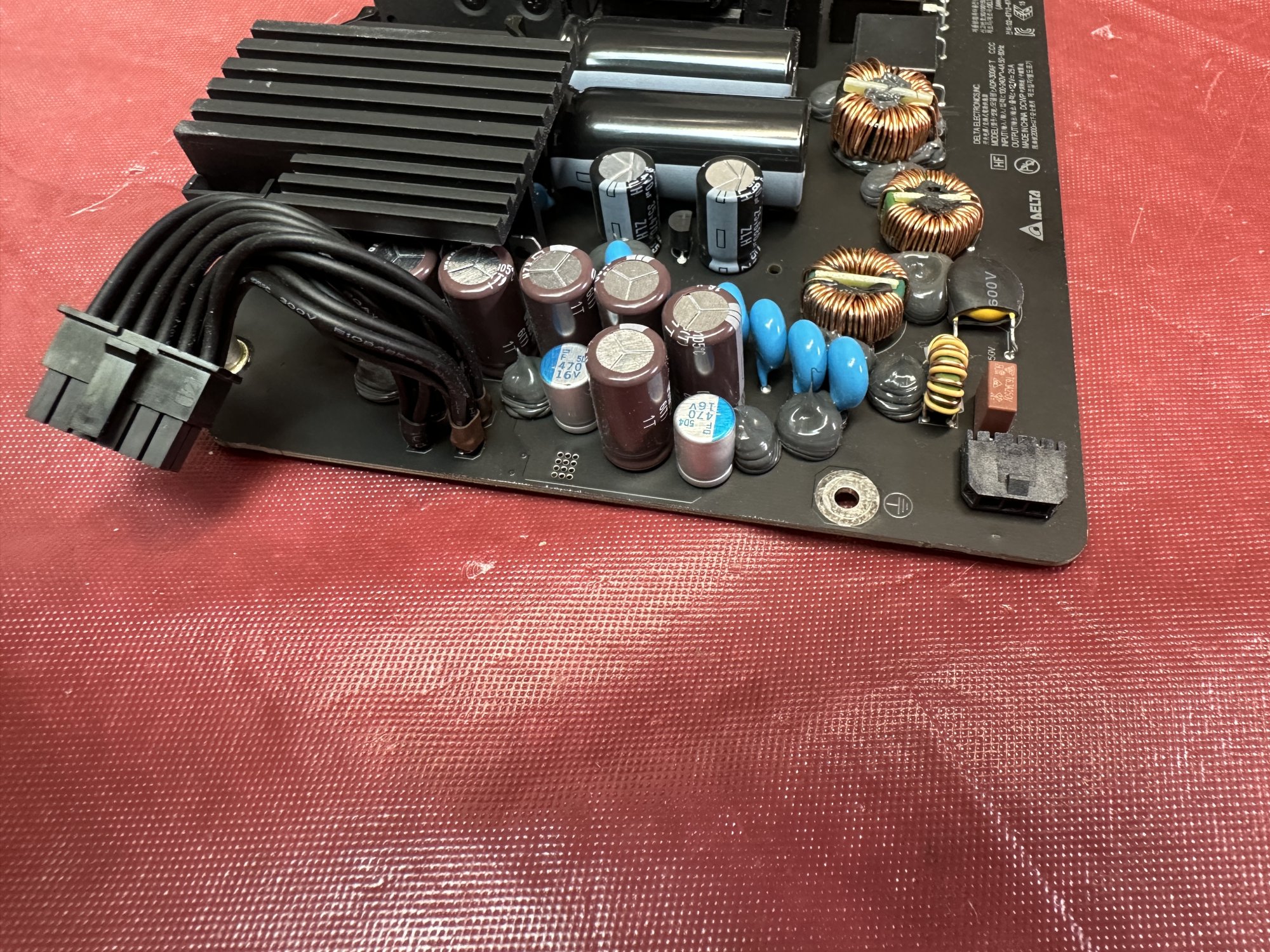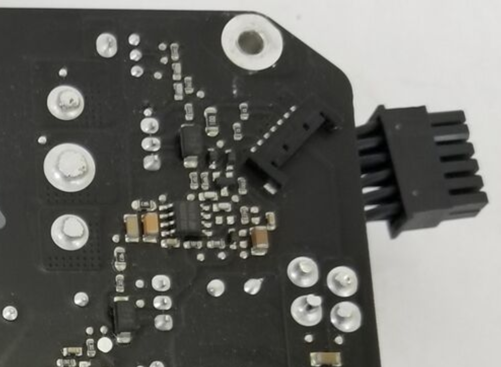 The small connector, if connected, must then be the one to handle the SMC bus and supply control. This image isn't sharp enough to see anything. I'd need closeups of the PCB tracks and the designations of the 3-legged components (the tiny one, and the two on the other side, mounted to heatsink) and the IC. The IC is likely the SMC chip. For supply control, the 3-legged surface-mount part is a bit small, that's not a power FET.