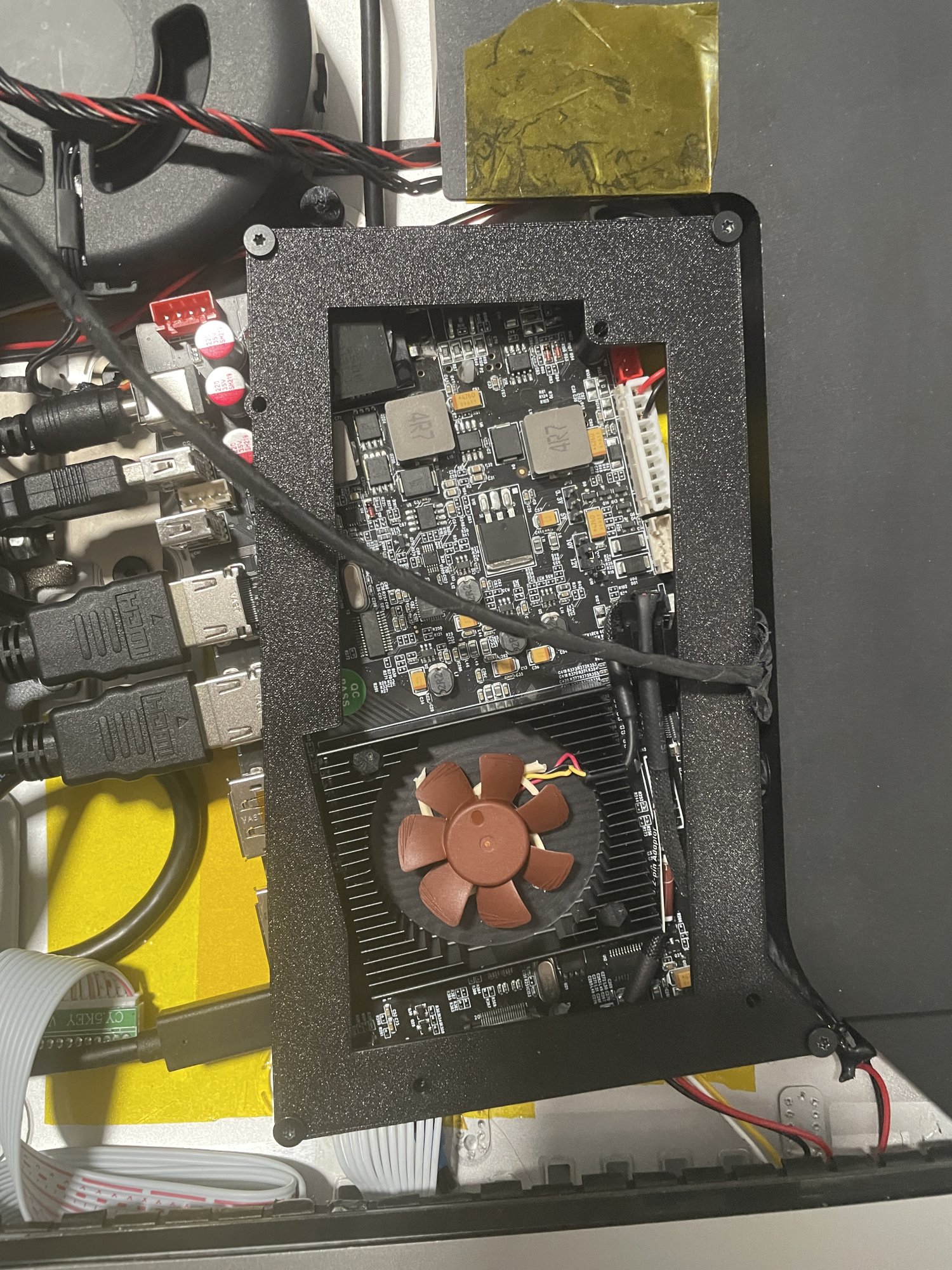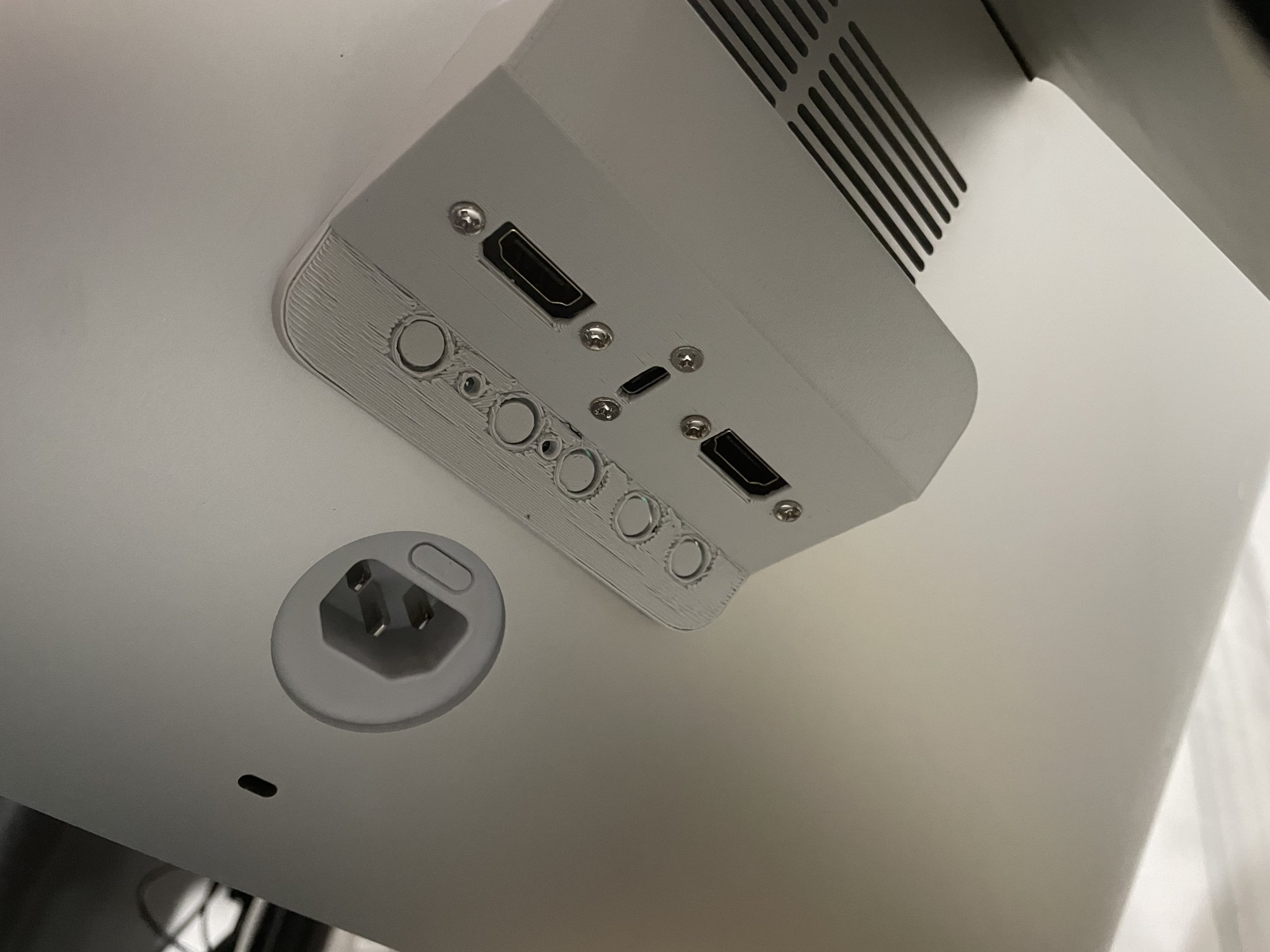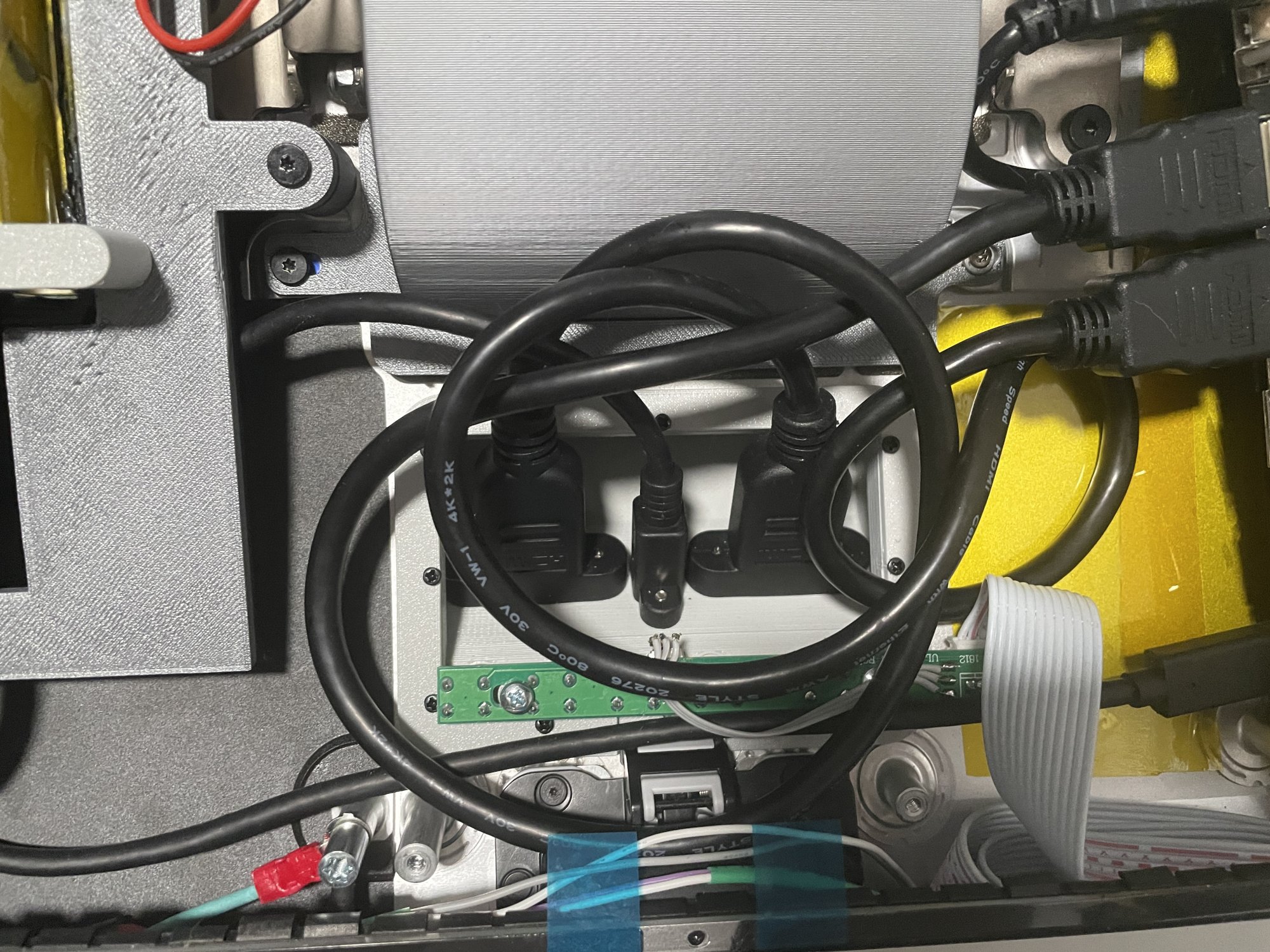 - RAM door cover replaced by a 3D printed piece which exposes 2x HDMI and 1x USB-C. I used extension cables to route I/O to the rear. It also houses buttons and IR receiver.