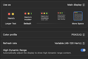 Since now my wife is using C2 with a native HDMI 2.1 on her PC, I decided to go forward and give Asus a try. It works flawlessly with my M1 Max MBP. It not only supports 4K@120 but with full color space and even VRR: