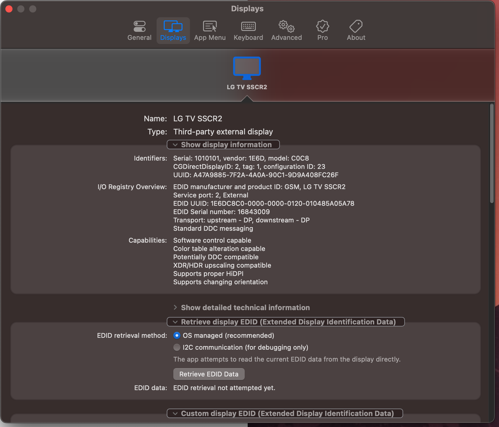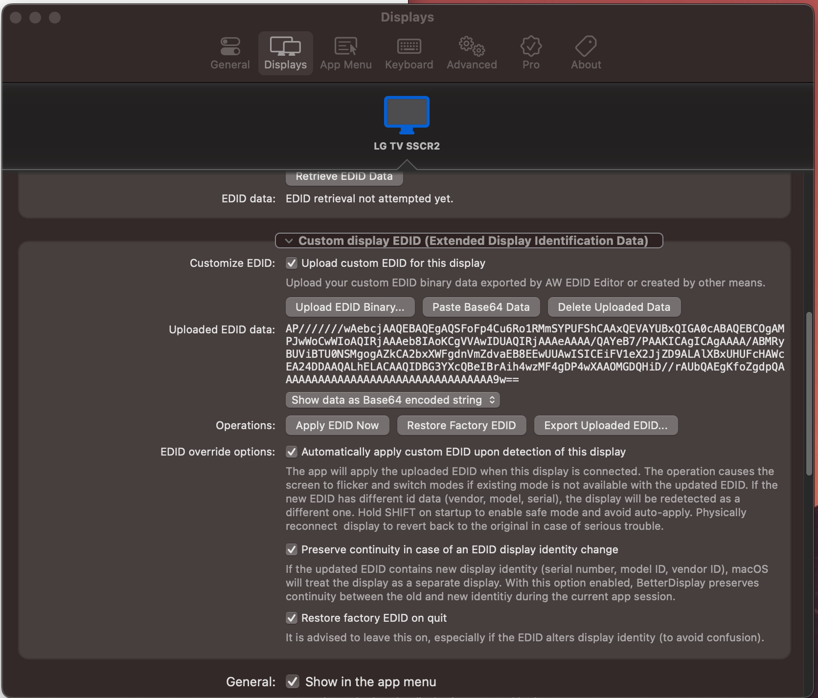 I exported and uploaded the custom EDID binary in BetterDisplay however after it is applied there's been a range of issues e.g. no signal to TV, TV reporting 'invalid format'... Tried doing it multiple times however no success.