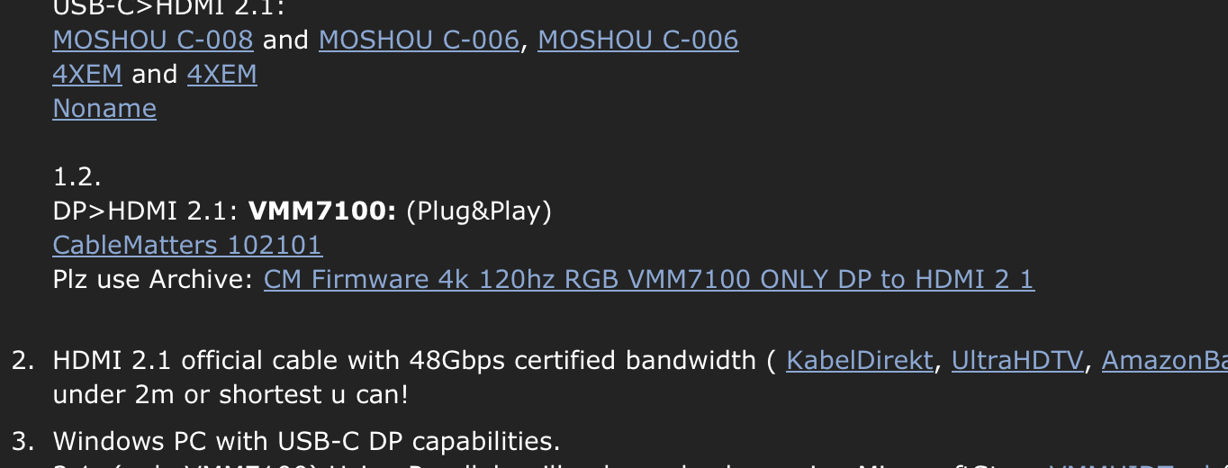 So could I plug my TB3 dock with DP 1.4 into my Windows laptop to flash this? I don't have anything with full-size DisplayPort port besides my dock. How did you flash it?Good news! We now have a standard DisplayPort 1.4 to HDMI 2.1 adapter from cablematters. I was just provided a new firmware file from them and it works flawlessly. I am using a CalDigit TS4 dock with this adapter plugged into it's DisplayPort out. I have an M2 Max MacBook Pro with an LG CX OLED 48 inch and I am not using better display as it uses the VM7100 chip just like the USB C version. DO NOT USE THE FIRMWARE FROM THE USB C ADAPTER! It will brick your adapter. I have attached the file for the DisplayPort to HDMI adapter below and linked to the amazon link where you can purchase it. Make sure it is model 102101 before you flash this firmware and that it is using VM7100. This is great news for those of us using thunderbolt docks that have DisplayPort 1.4 as we no longer need to use an entire USB-C or Thunderbolt port just for our display out. Hope this helps!