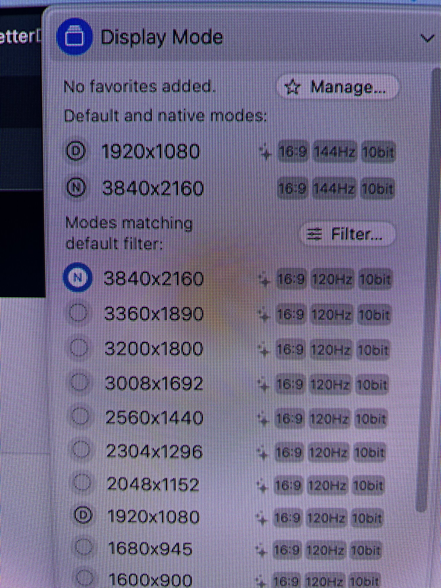 Edit 2: apparently better display says I am using 10bit (throwing another image down there). Funny thing is that when I select 4k 144hz, better display still says I am using 10bit, and the 4:4:4 test image also looks sharp… I am definitely missing something here, I though all these combine wouldn’t even be possible with 40gbps cap of thunderbolt 4.
