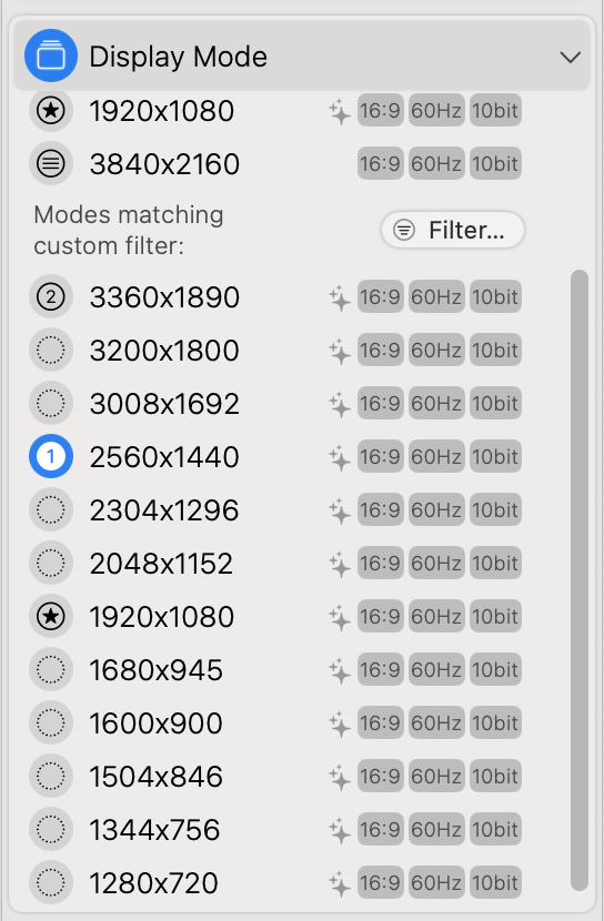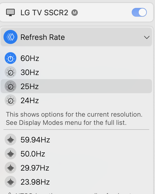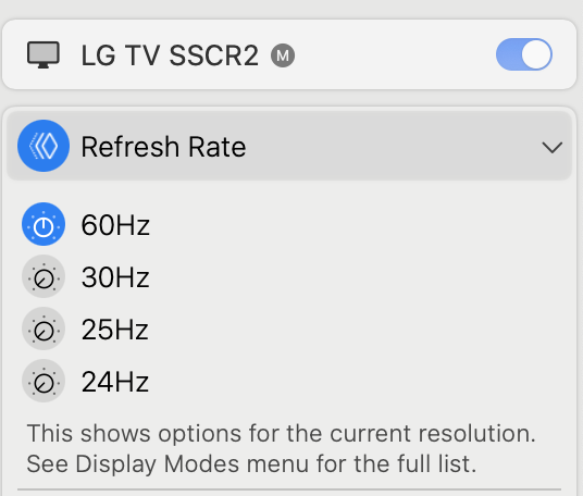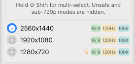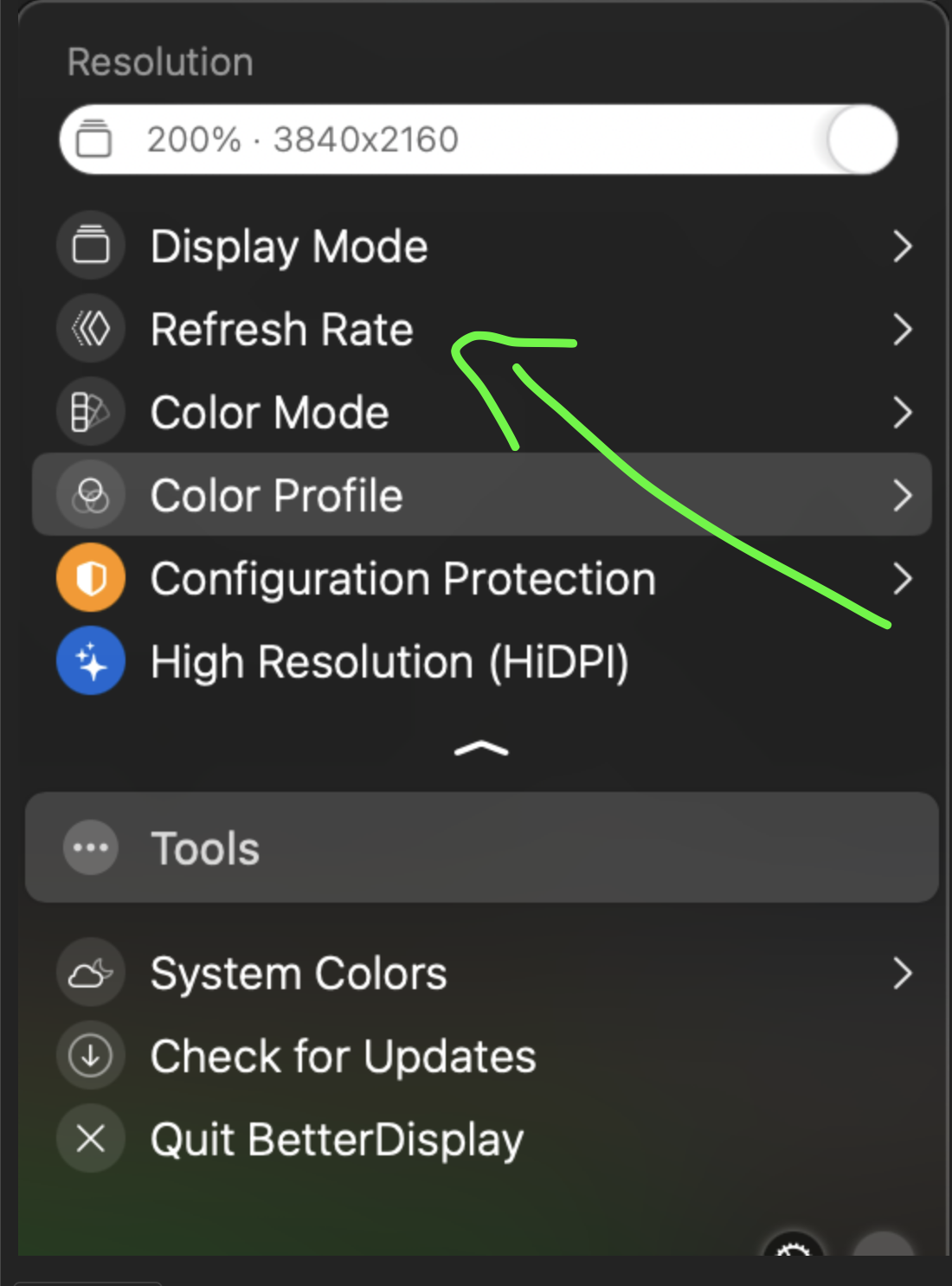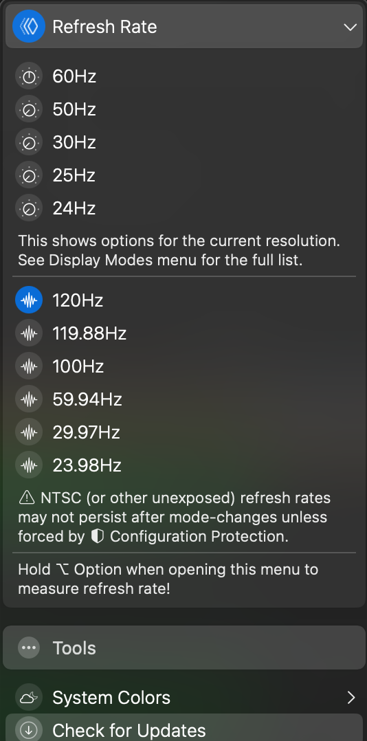 That's all I have for options. To recap, On BetterDisplay I set the resolution to 3840x2160 @ 60hz, made sure HDR was disabled, and enabled HiDPI, but the coveted 120hz rate still isn't available to choose from. I'll keep testing once I get the Pro version of BetterDisplay so I can access the advanced configurations.