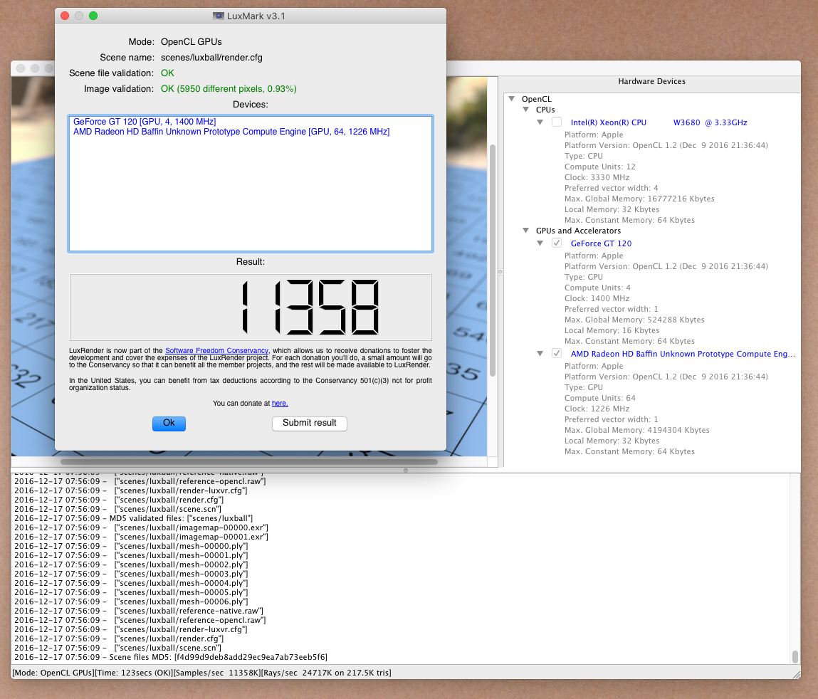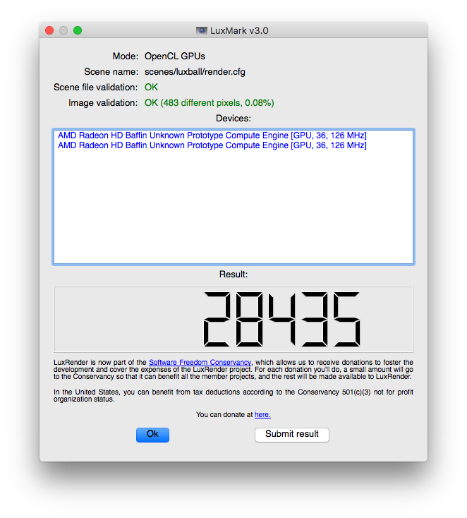 Before the Hex string edit I was getting a 11413 score in LuxMark. Now, my LuxMark score is 14199. That's nowhere near the 20k mark other users are reporting on Tonymac but it's a nice upgrade overall. Render times in Cinema 4D are also a lot quicker and LuxMark is also reporting 64 Compute unites. Don't know what that means as the card manufacturer states it has 36.