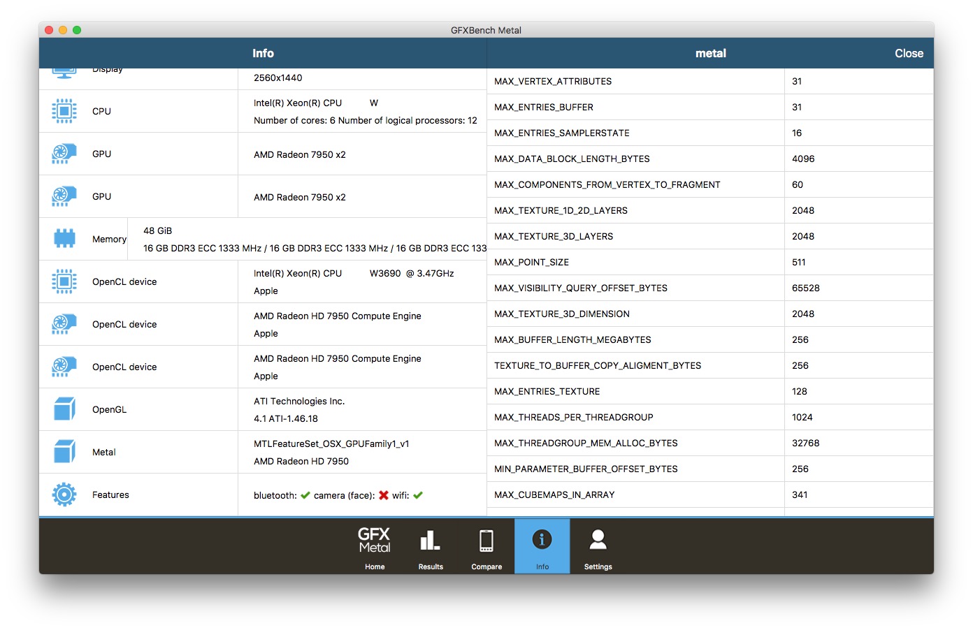GFXBench does nothing. It made me download almost 300MB of scene data and it won't run any tests or give me any messages to indicate anything happened after I press 'Start'