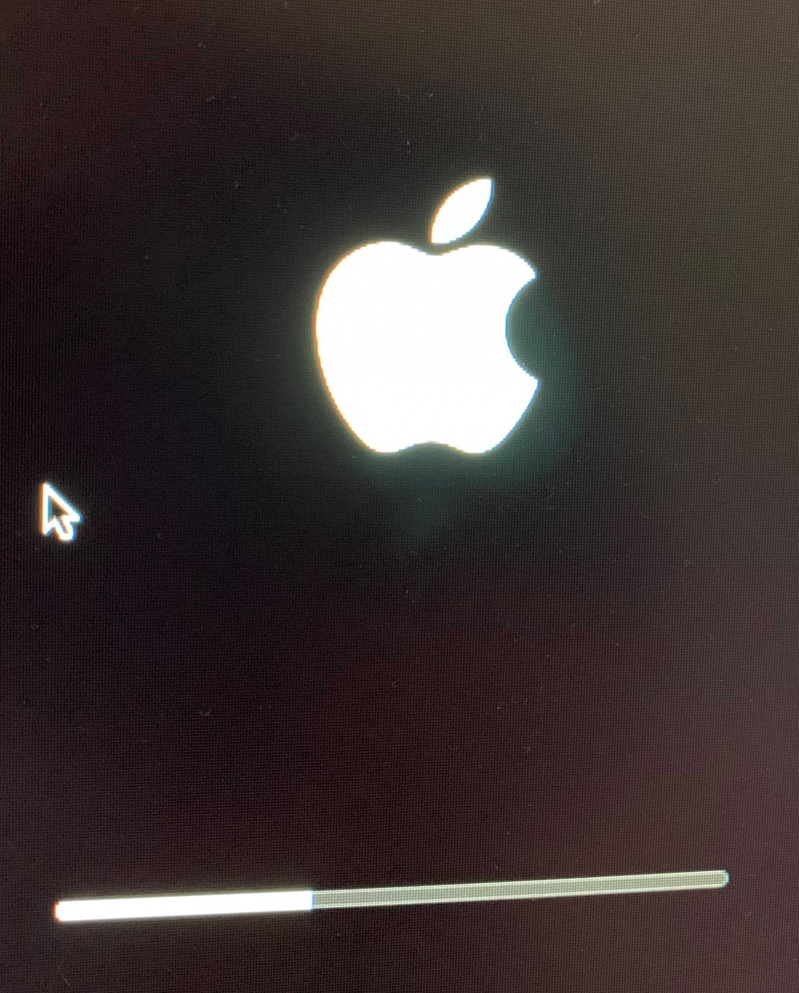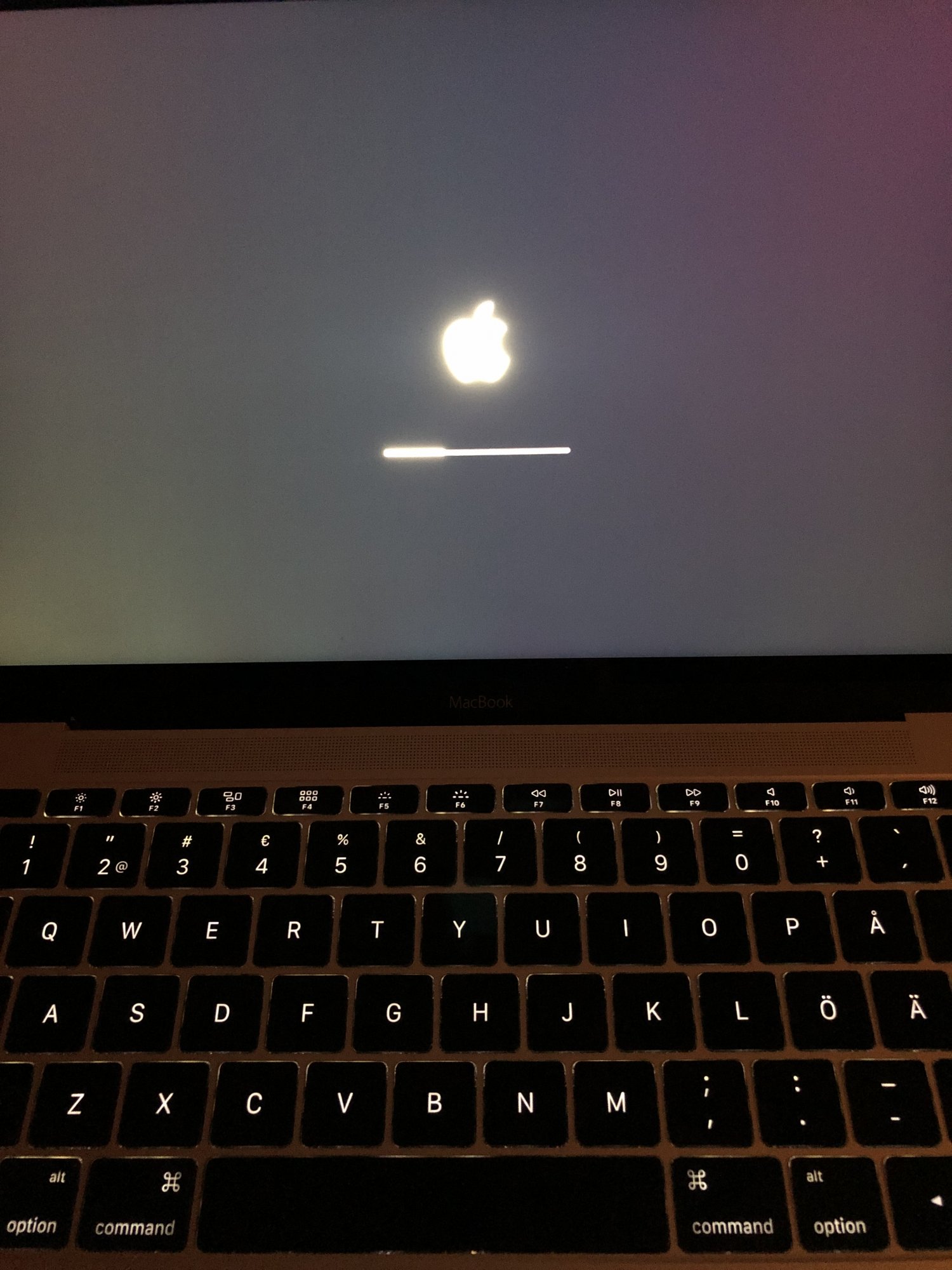 Mine is in exactly the same place. None of the safe mode, recovery mode options work for me. It's been like this for around 12 hours no. Still no luck rebooting, Apple Support have suggested I take it for service... Not happy!During the installation, my MacBook Pro stuck on a blank black screen. I tried to boot from USB, boot recovery, reset NVRAM, SMC with no luck. Seems like the notebook is bricked. When I press the power button, only the screen turns on and the Apple logo on the lid back. no sound, no Apple logo at screen, nothing.