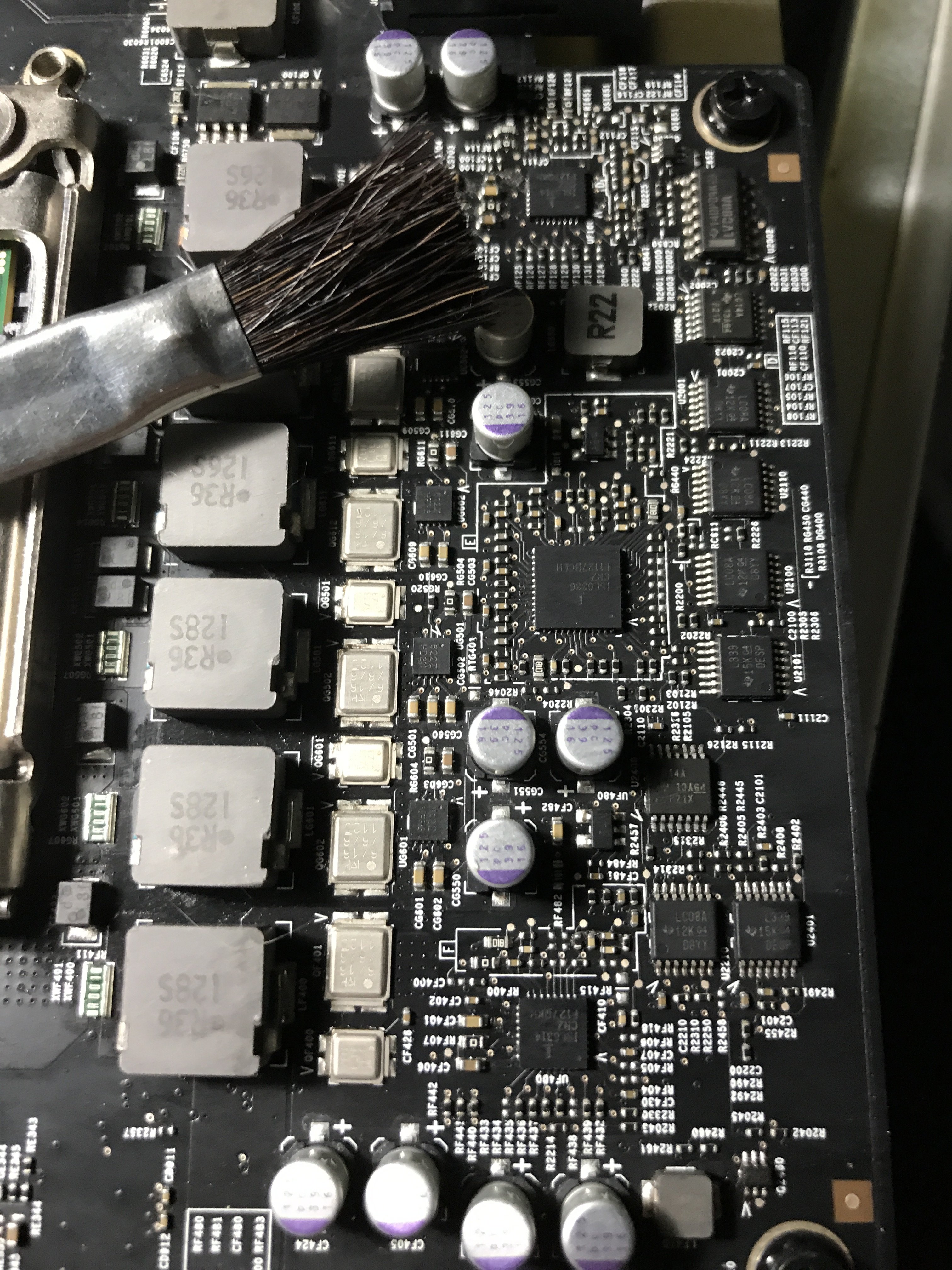 Isopropyl alcohol combined with a firm brush did the trick to remove the oily grime built up from the thermal pad break down.