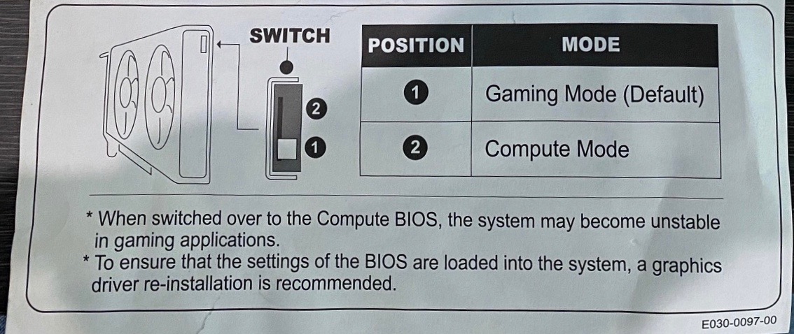 I may have reported the wrong thing - the card works when the switch is outboard from the motherboard direction, which is not the Default Gaming Mode, it is the "Compute" mode. Fortunately for me it is possible to push the tiny switch towards the motherboard while the 5,1 is running. Going outwards from the motherboard would be quite difficult and uncertain. I will take lots of photos to confirm the switch has moved before flashing.