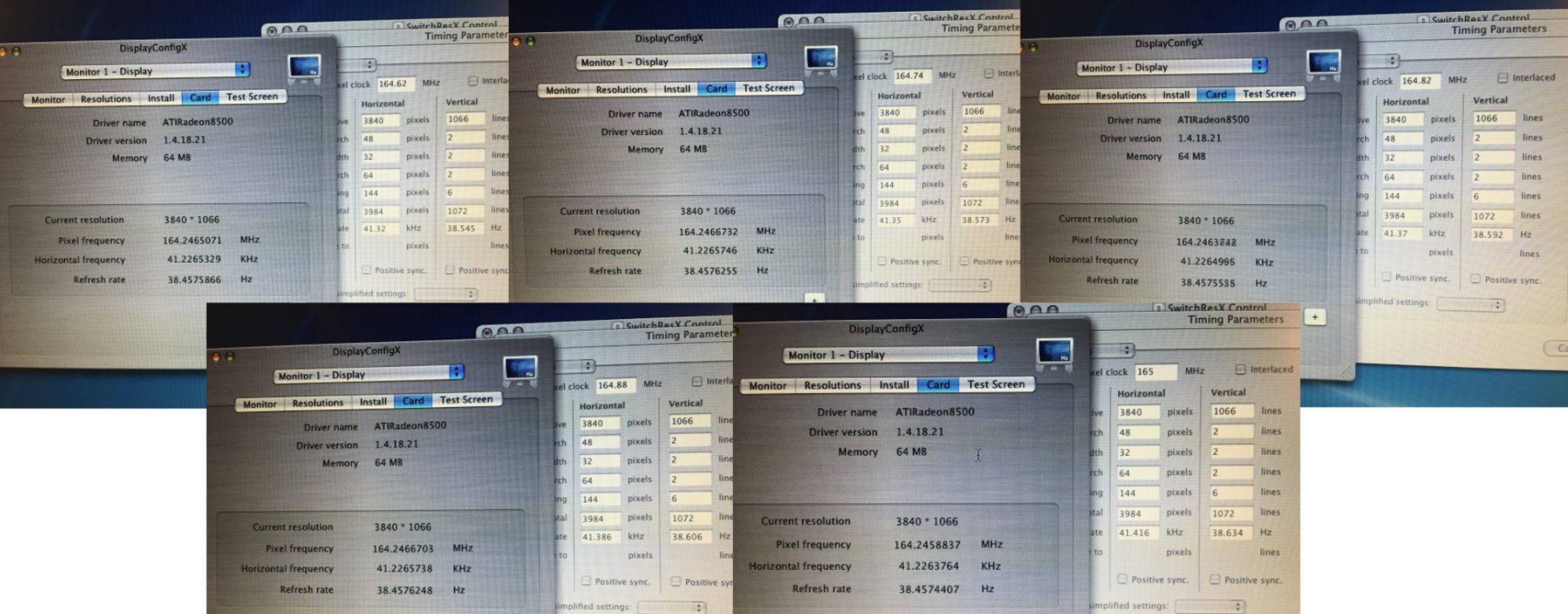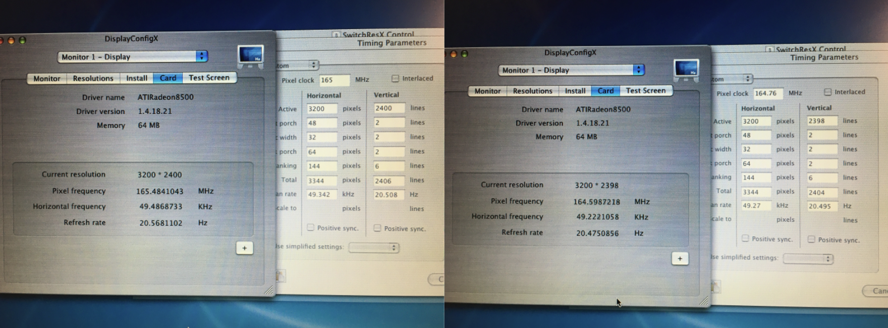 Since the TiBook's Radeon output timings can be directly monitored by DisplayConfigX, I've spot checked and discovered that none of these small adjustments actually affect the card's output at all. It never exceeds 164.247 MHz. So the T221's scaler is reading the signal accurately, and Mac OS is reading accurately what SwitchResX is specifying in the override, but the Radeon doesn't explicitly obey the override's timings.