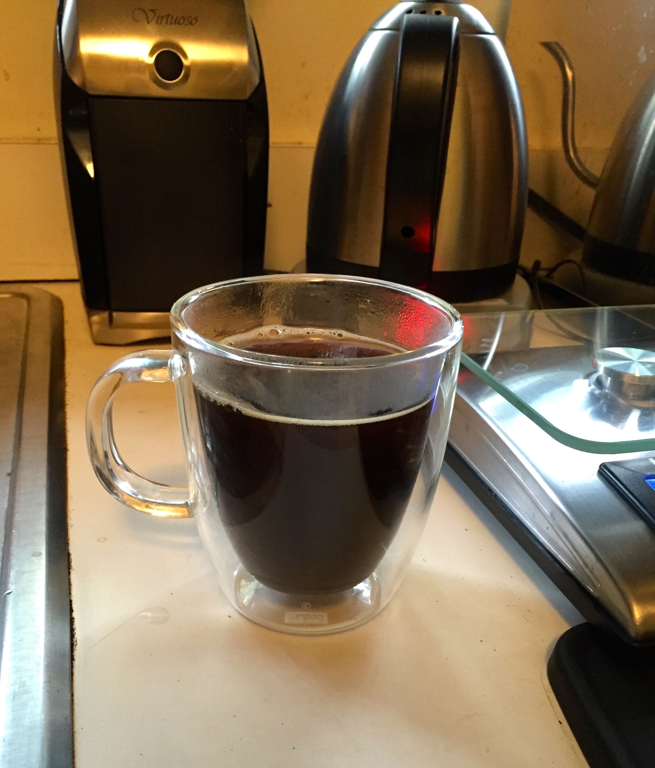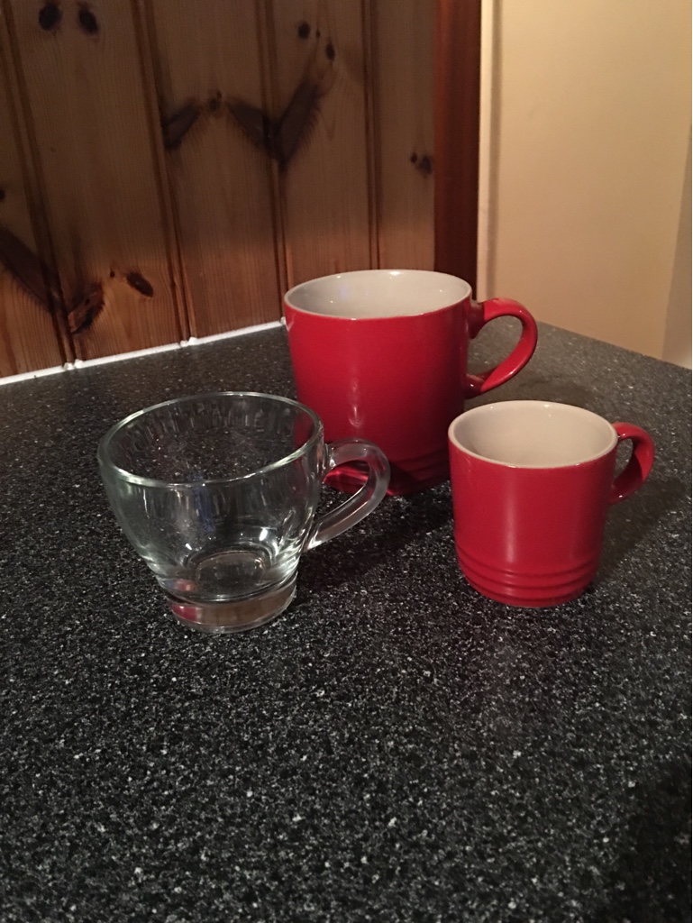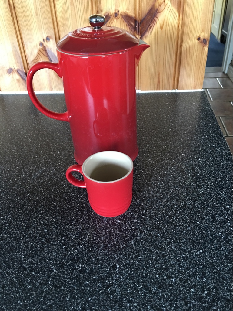 I just enjoyed my afternoon coffee in my crummy old Bodum glass cup. No fancy shmancy, orangey shmarengy, hot stuff porcelain Le Creuset cup for me… just a plain old, down to earth, blue collar, Bodum double walled glass cup for me.