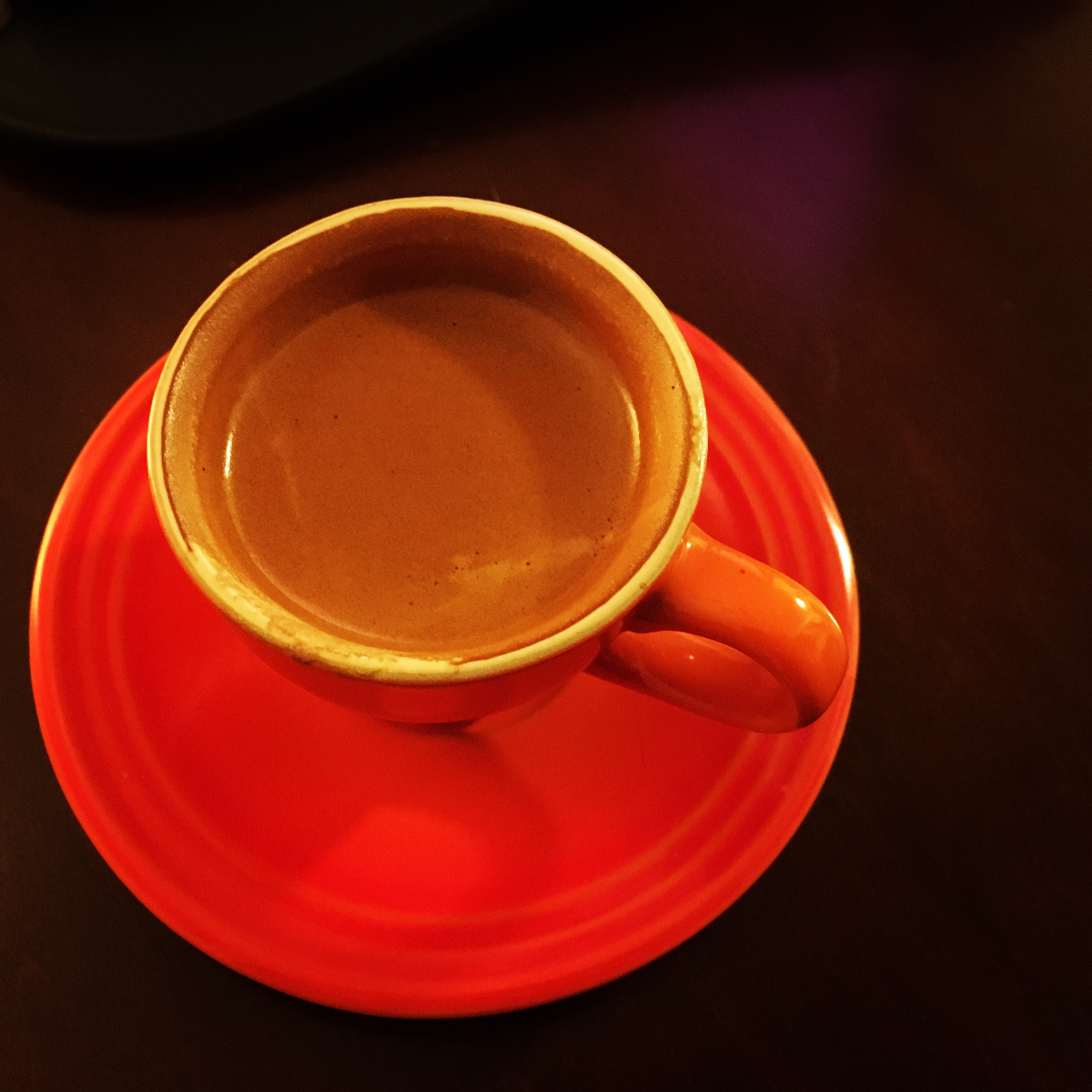 I already had a few sips when this picture was taken. I just love how the surface tension between the Le Creuset cup and the crema bind together on the sides like that. It's science in action! I don't get that kind of surface tension on the glass cups though.