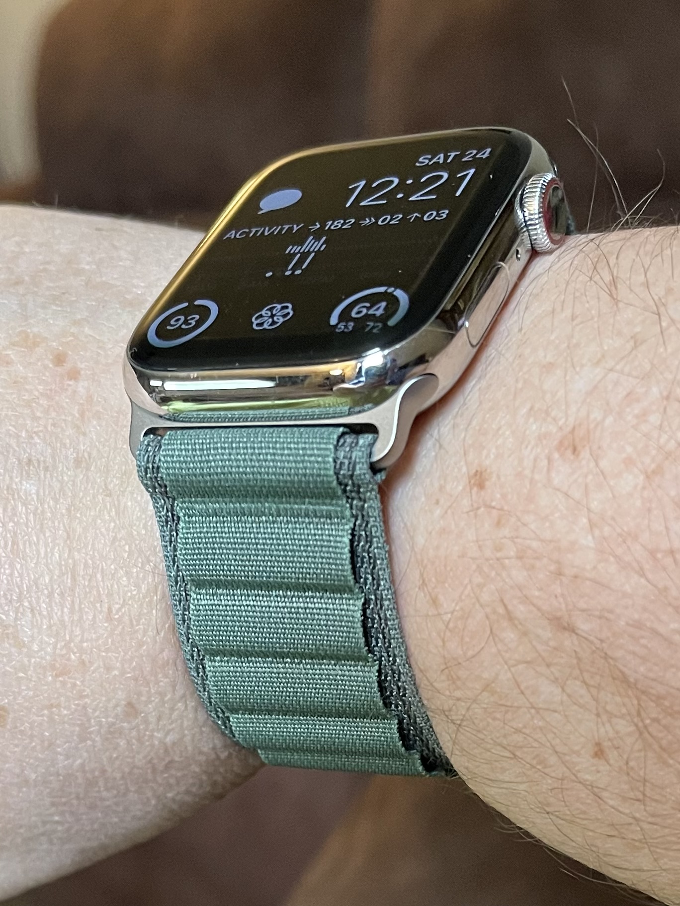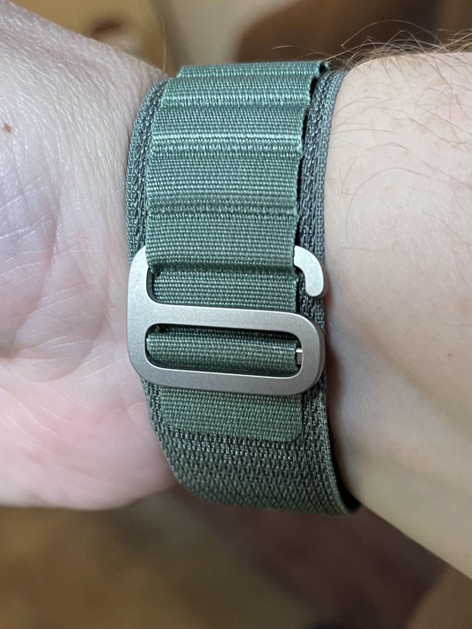 Green Alpine Loop on my 7. I love that the loops are close enough together to not be too tight on one, but not too loose on the other. Super comfortable too. The end curves a bit more than I thought it would, so I’m not worried at all about it slipping out.