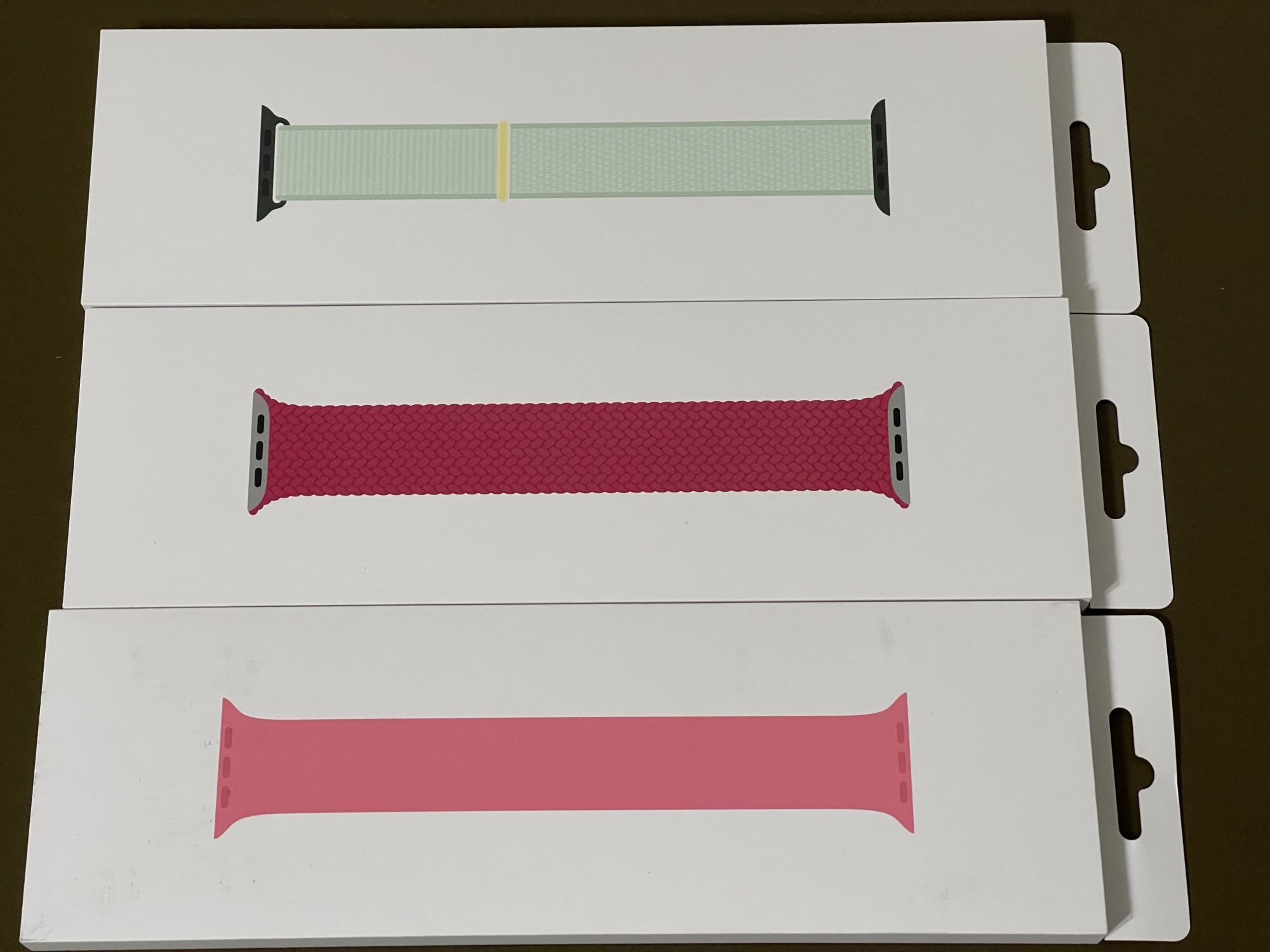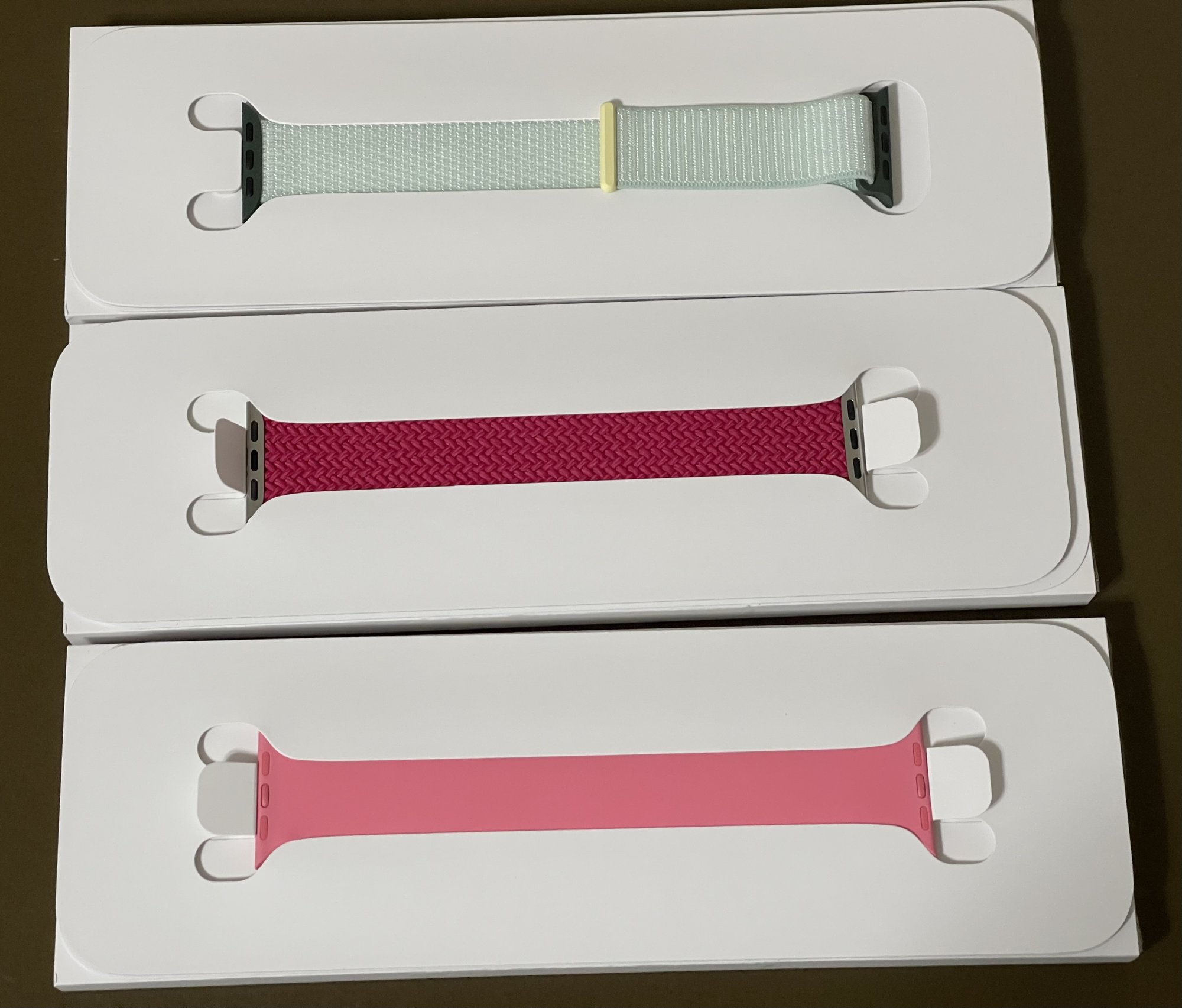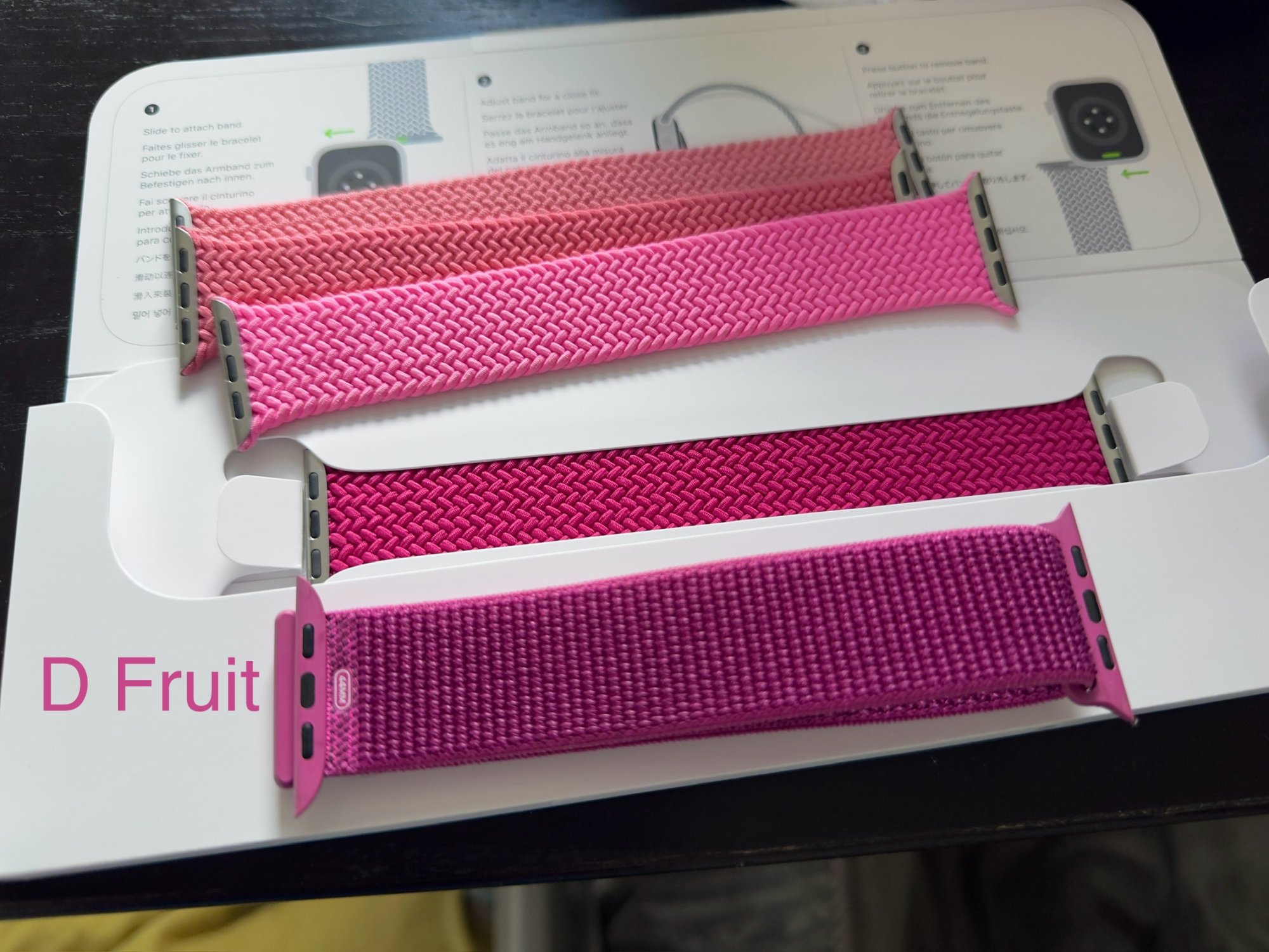Thanks for your pictures I am so looking forward to receiving my order. I only received 1 of the 8 bands I ordered today. I received Ocean Blue solo loop which came FedEx. The other 7 are delayed in transit according to DI OVERNITE. Hopefully, they arrive tomorrow.Raspberry braided solo loop (I wish I could share these in HDR somewhere other than iCloud!)