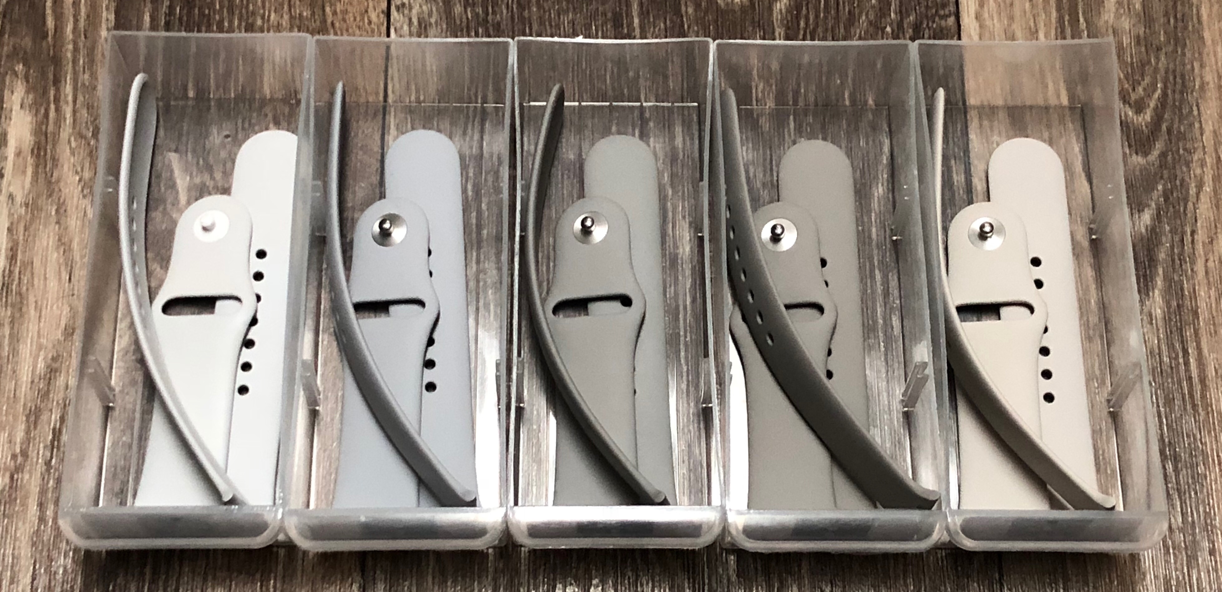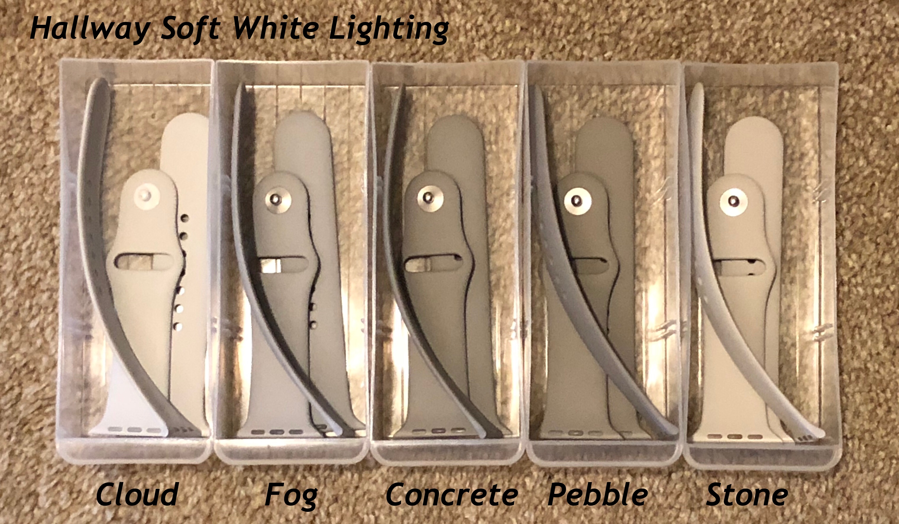All the above. Here are a few of them all together: Cloud (from Edition), Fog, Concrete, Pebble, Stone.Fog is quite a versatile color, goes well with all watch colors. It's basically a cold light gray color.
