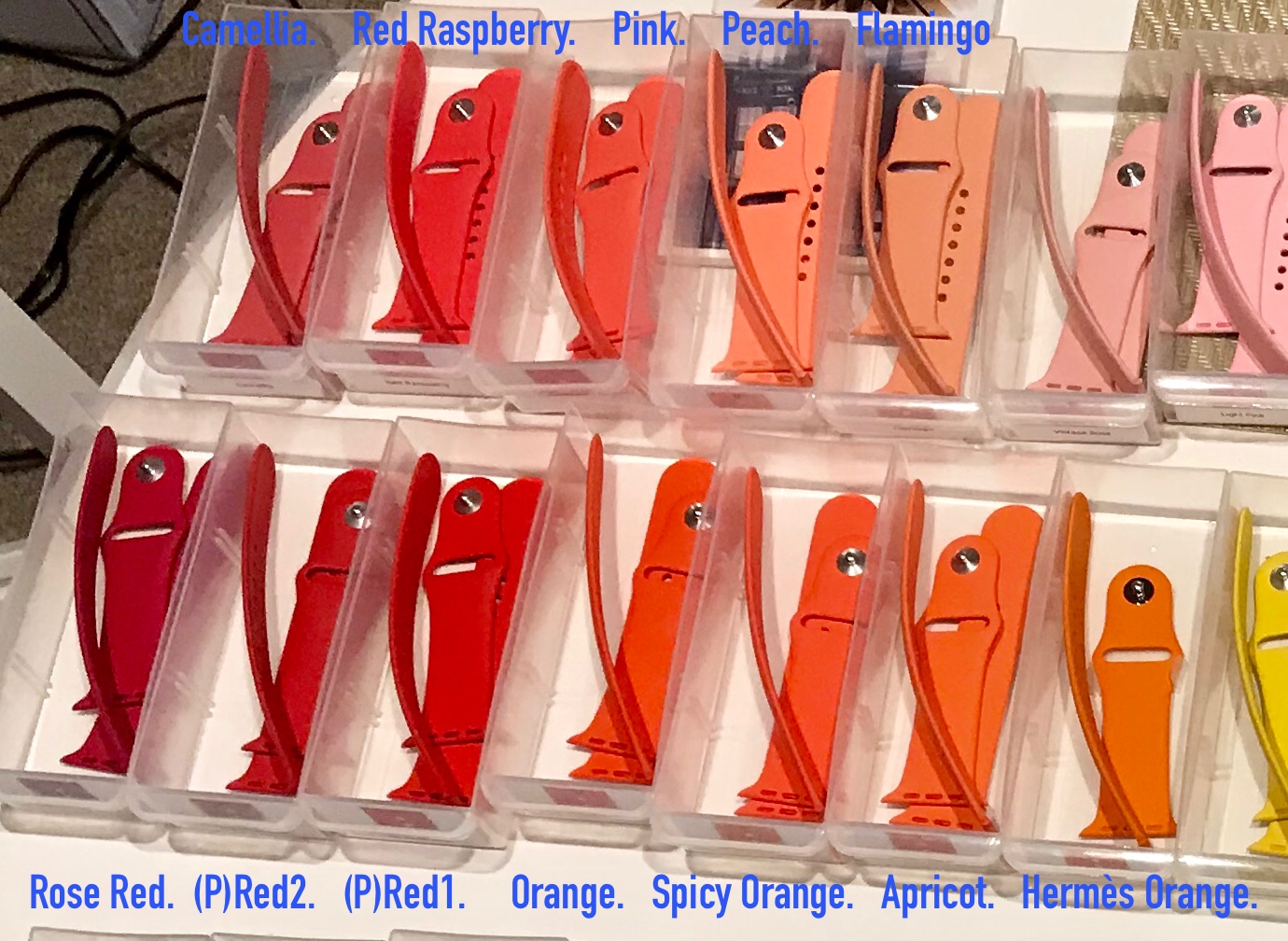 I will just re-post the photo which was already posted here by @PeterJH3Could I trouble one of the kind Forum Members to post a comparison photo between the Flamingo and Peach Sport Bands? I’m trying to decide between the two and from what I can tell they are quite close in terms of shade. My search for a useful comparative image has been to this point unfruitful...