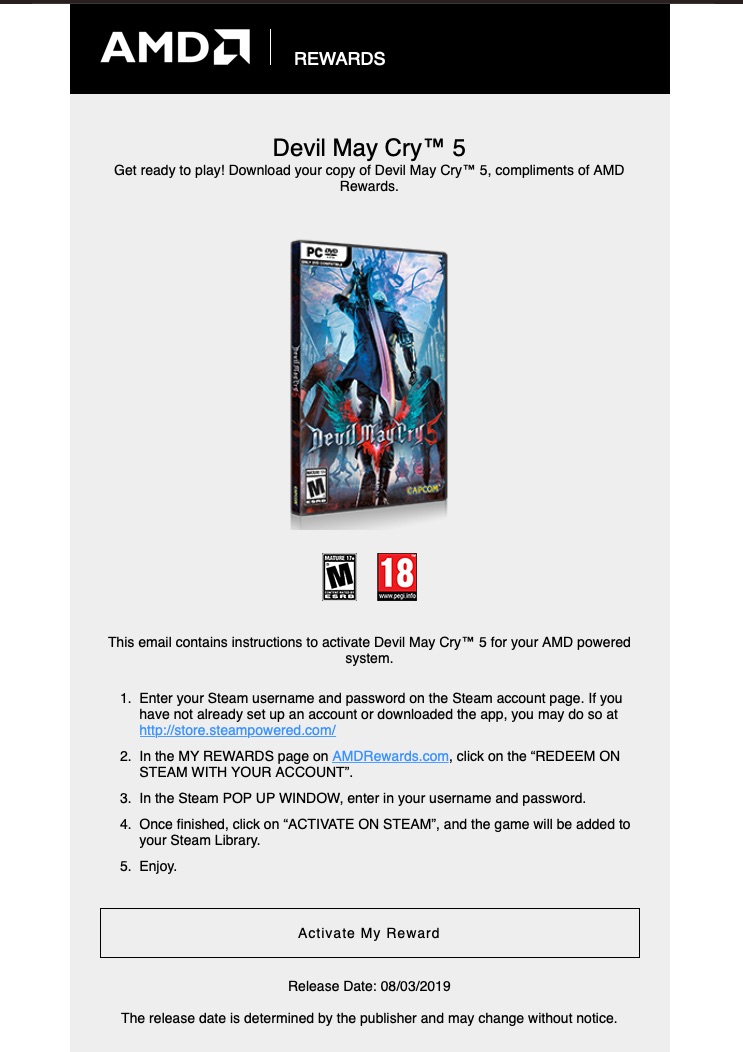 AMD sent an e-mail just yesterday announcing release of the second game, Devil May Cry 5. This e-mail is tailored to the fact that I use Steam, but that is not required: