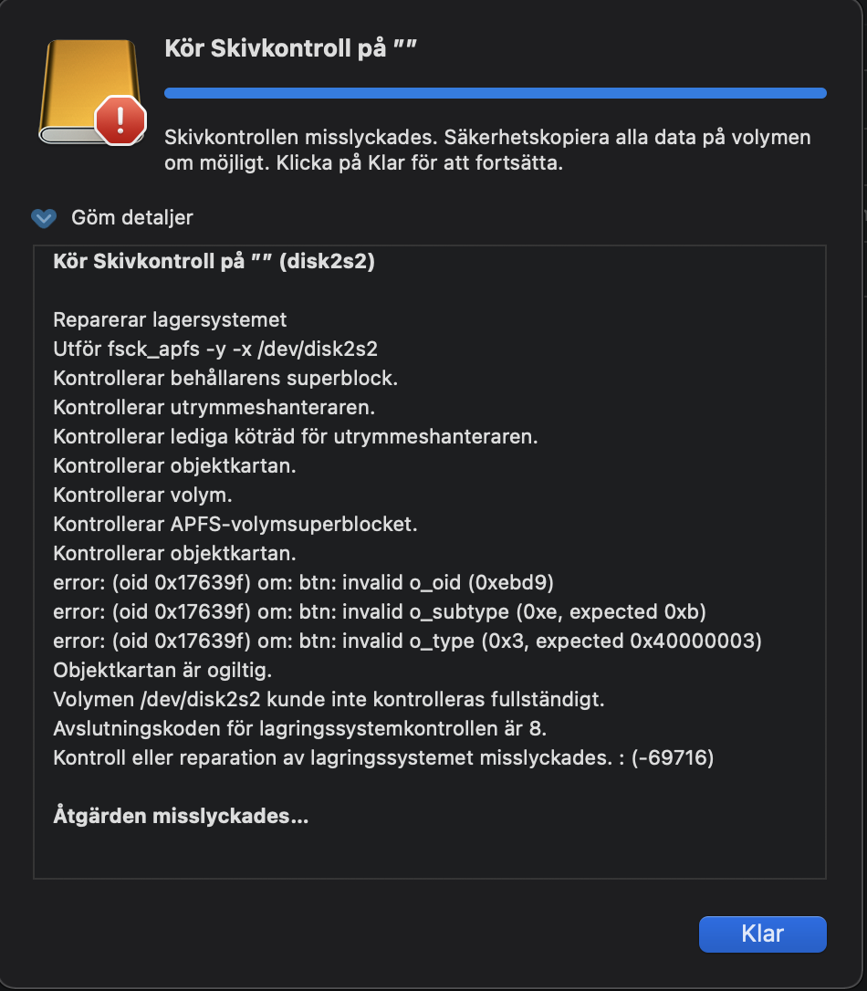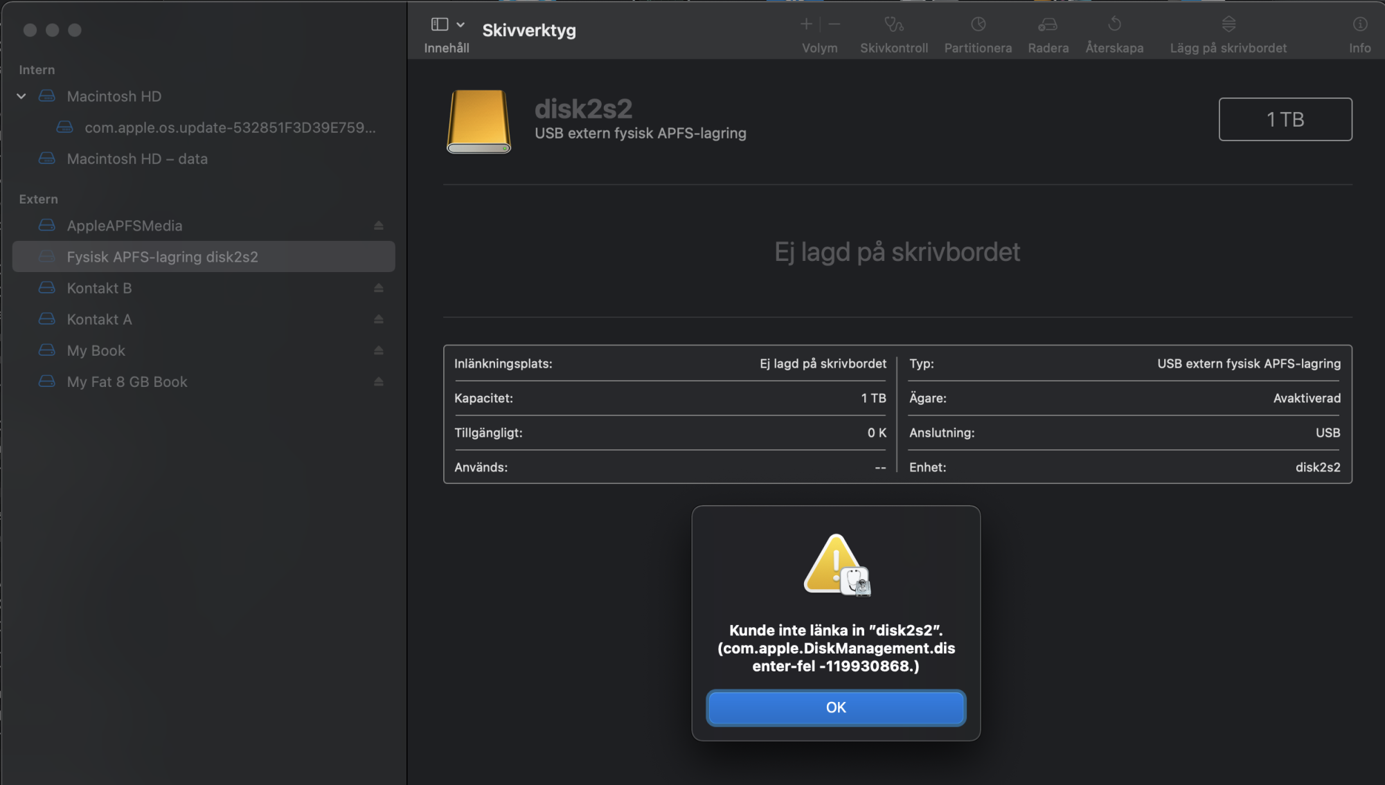 Now it doesn't mount. Tried different actions with disc util, as "mount on desktop" and "show info" (see images).
