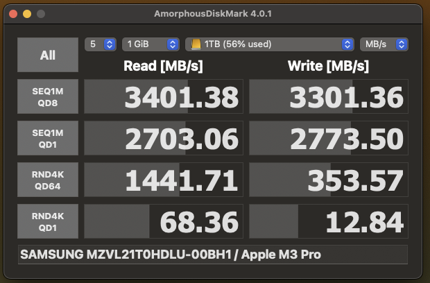 I'm on a MacBook Pro 14", M3 Pro / 18GB / 512GB. The drive is formatted APFS. Drive is a Samsung PM9A1, but I had the exact same issues with an SK Hynix external SSD. My primary use case for this drive is as an external game drive, and it's basically useless for this with the real-world performance I'm getting.