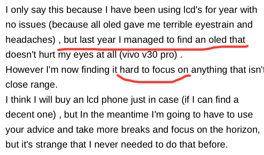 Yes, whilst better than the Magic6 Pro I had tried previously, there was still something my eyes/brain did not agree with, so sent it back. Having had my iPhone 8 crippled by having to update to iOS 16 for a banking app I use (so the issue isn’t solely OLED, Apple software is also an issue) I am currently using a Moto G75 and the screen is lovely, no issues whatsoever, it’s how screens should be.